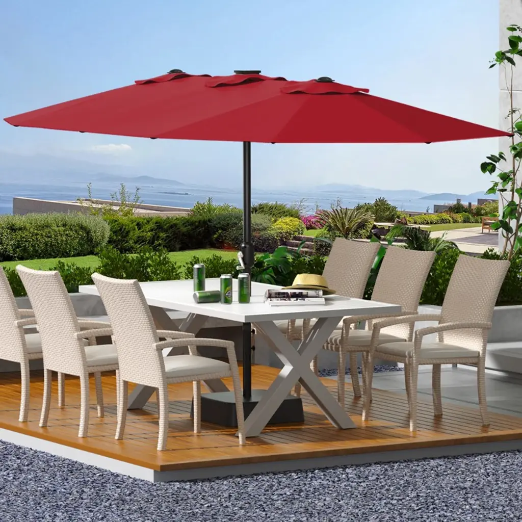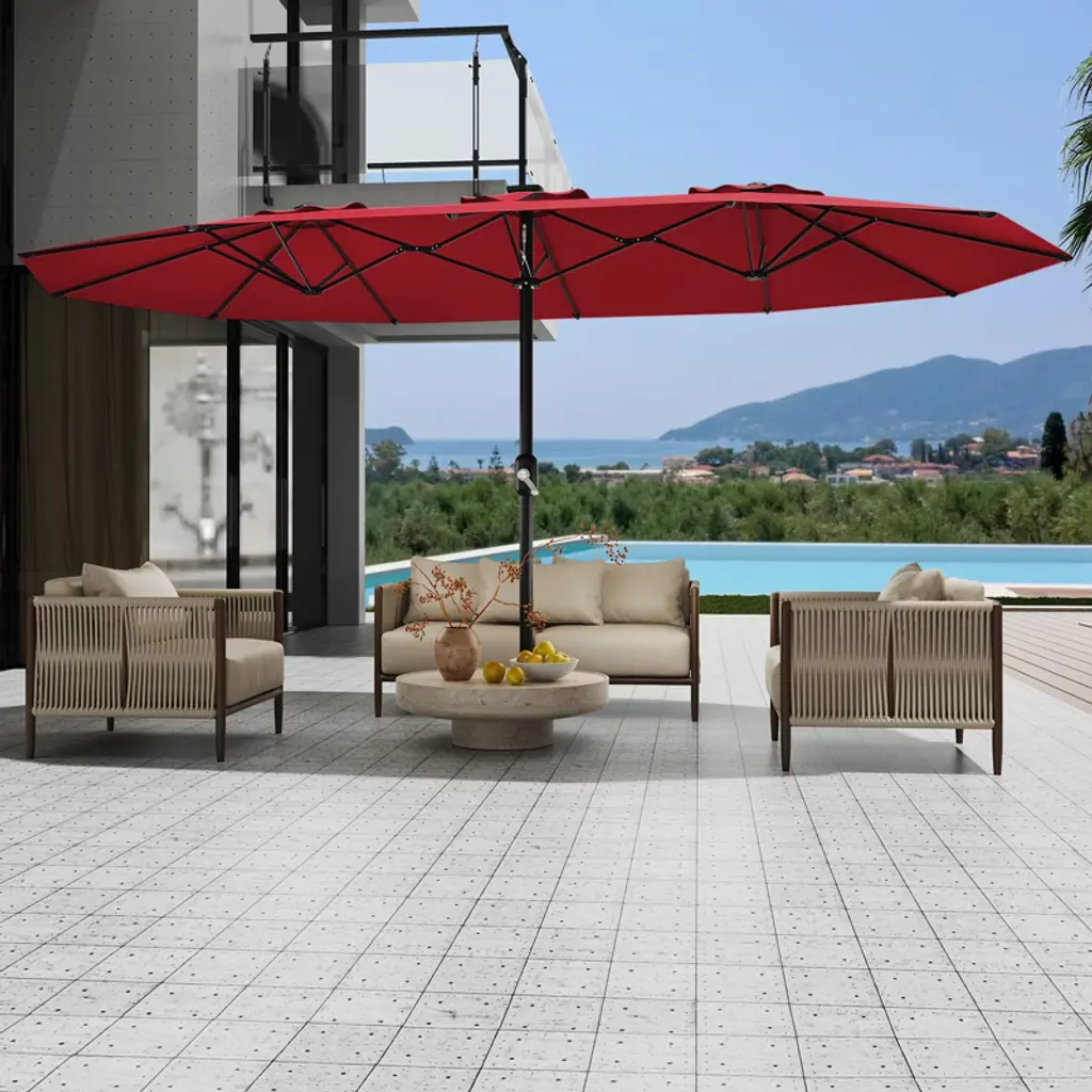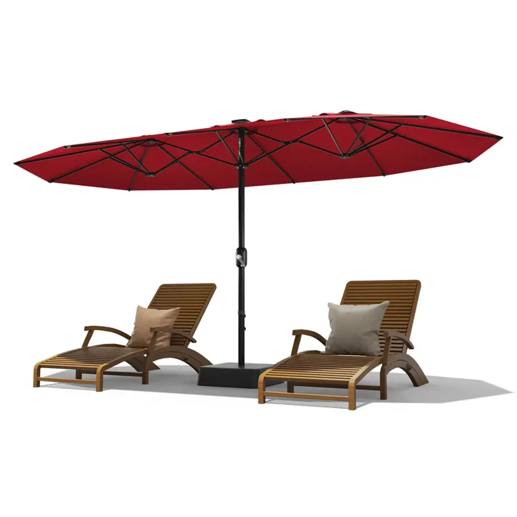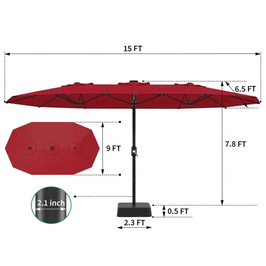 15ft Large Patio Umbrella with Base – Ultimate Outdoor Shade Solution Elevate your outdoor living with our 15ft x 9ft double-sided patio umbrella, delivering 135 sq.ft of UV-protected shade for poolsides, gardens, or backyard gatherings. Built to last with 12 rust-resistant alloy steel ribs and a powder-coated frame, it withstands wind and weather while the crank lift & tilt design ensures effortless adjustments. Includes a heavy-duty base with 2 sandbags (200 lbs total) for stability and a fade-resistant canopy backed by a 3-year durability guarantee. Perfect for homes, cafes, or beaches—upgrade your space with premium shade that blends style, safety, and convenience!
