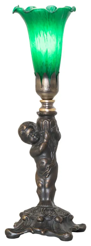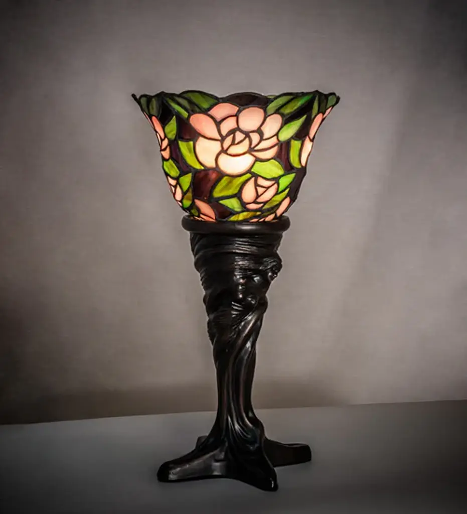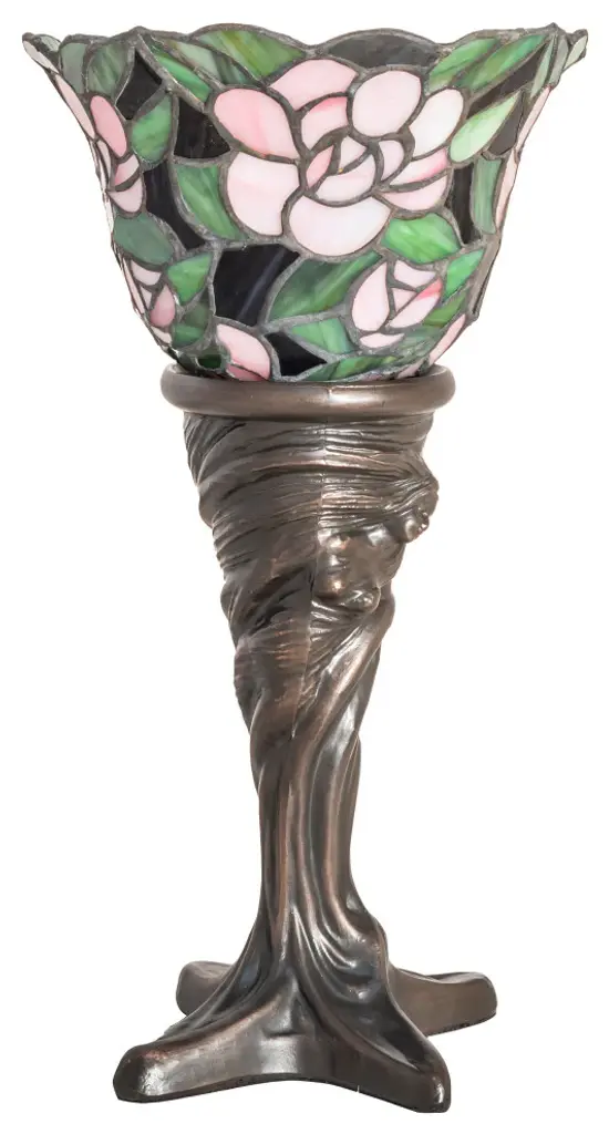 Bring a beautiful garden into your home with this Begonia Mini Lamp. Blush Pink Begonia buds and flowers amongst Garden Green leaves adorn the art glass shade which is paired with an elegant; ornate cast lamp base that is hand finished in a warm Mahogany Bronze. The Begonia Mini Lamp is featured in our American designed; handcrafted Stained Glass Lighting Collection. UL and cUL listed for dry locations. Each shade is a unique work of art with color variations based on natural ingredients inherent in the glass. Contact us if color matching is critical when ordering multiple items.