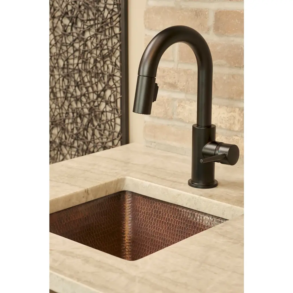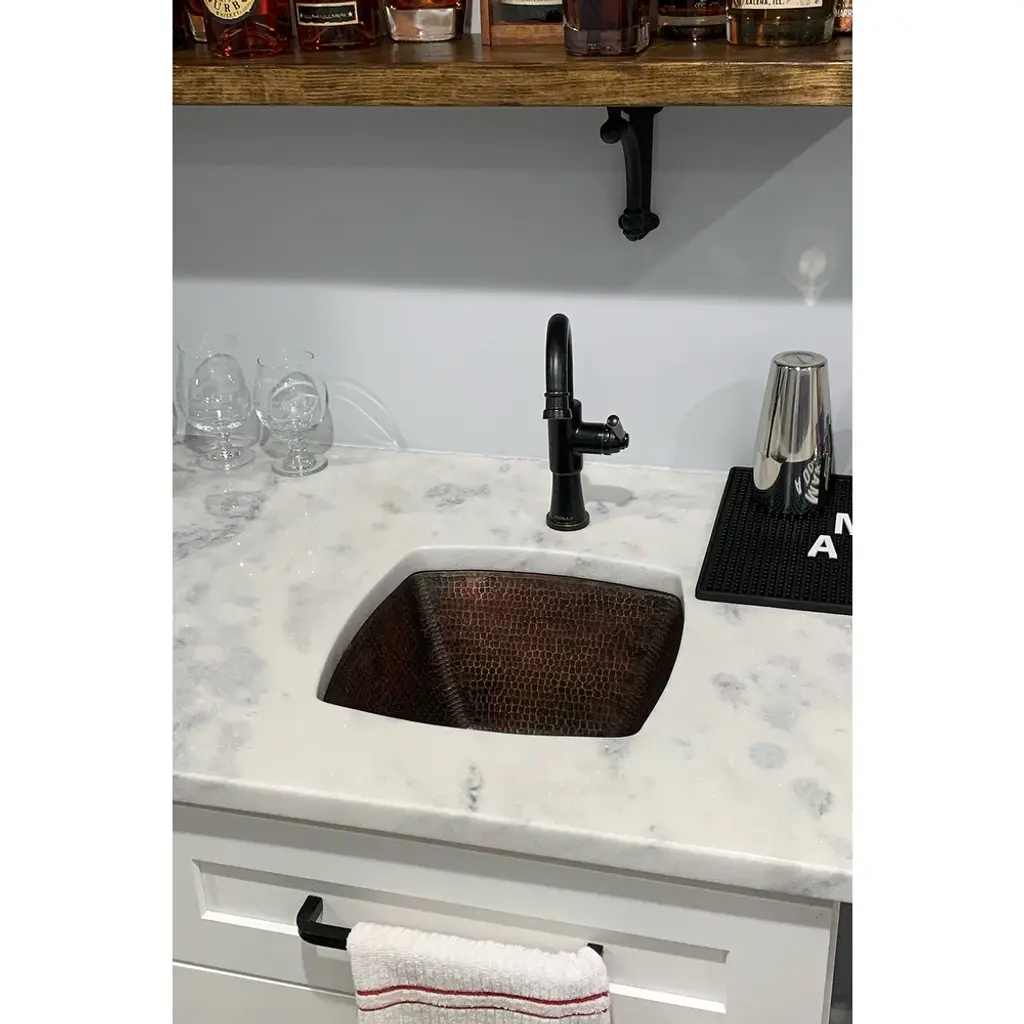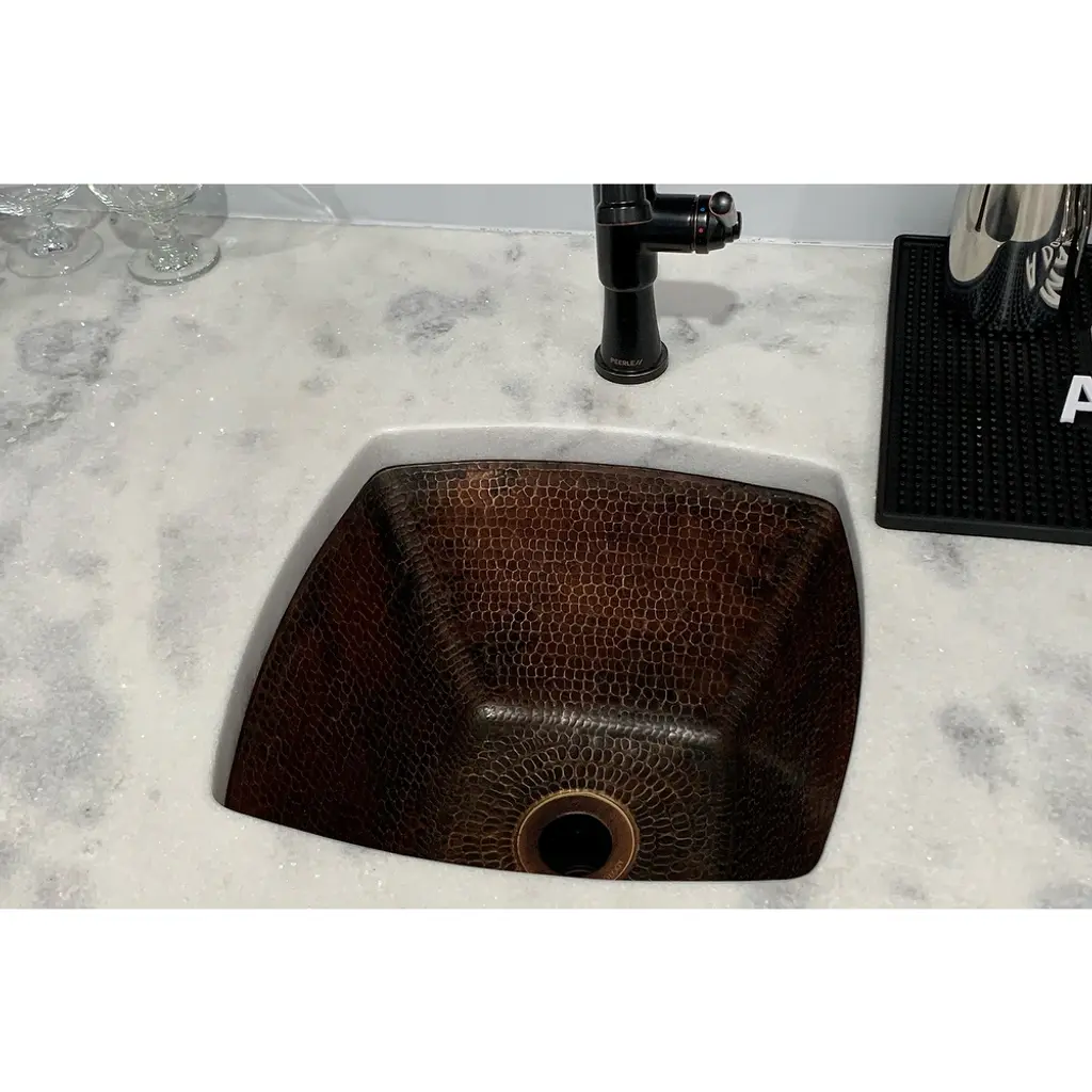 Add a touch of elegance and sophistication to your home bar or kitchen with this exquisite 15-inch square hammered copper bar/prep sink from Premier Copper Products. Handcrafted by skilled artisans, this sink is made of 99.7% pure recycled copper that will last a lifetime. Its oil-rubbed bronze color and patina finish add to its charm and character, making it the perfect addition to any home. With a 2-inch drain opening and a flat rim, this sink can be installed as an under-counter or surface-mount sink.Features:Included:Bar Sink Suggested Accessories: