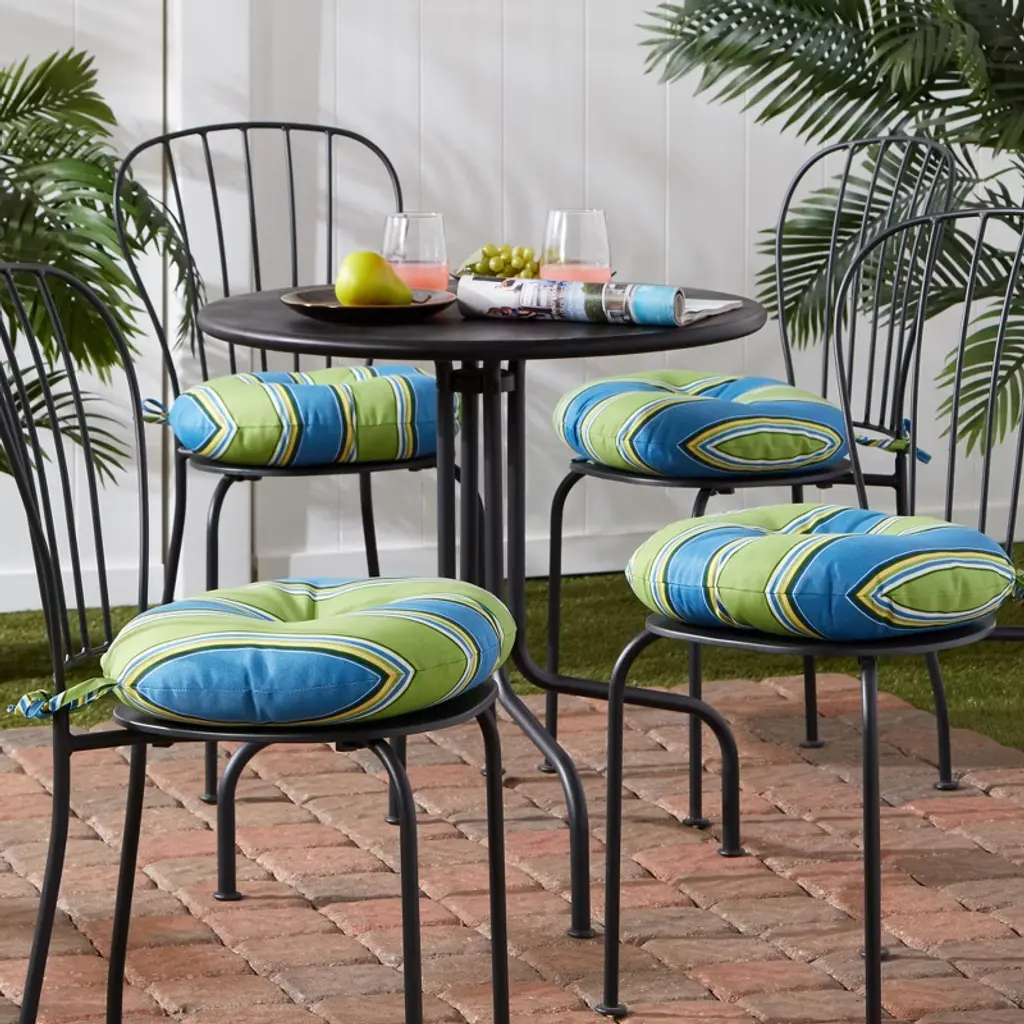 Add a bit of comfort and style to your outdoor bistro set with these Bistro Cushions from Kensington Garden. Cushions feature a center circle tack which prevents fill from bunching and shifting, and two string ties to keep cushions firmly secured to chairs. Made from durable, UV-resistant polyester fabric, and filled with a soft, recycled polyfiber. A variety of colors and prints are available to enhance your outdoor decor.