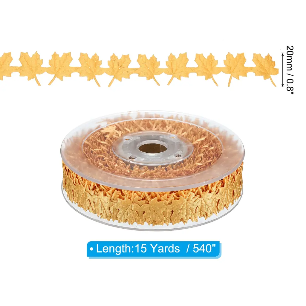 It is great for a wide range of craft projects, including floral arrangements, wreaths, gift wrapping, DIY decorations, scrapbooking. It provides endless creative possibilities. Suitable for birthdays, Halloween, Christmas, Thanksgiving Day, parties, bridal showers, and fall weddings. It provides endless creative possibilities.SpecificationColor: Gold ToneMaterial: PolyesterSize: 15 Yards x 20mm / 540 x 0.8 inch(L*W)Packing List: 1 x Decorative Leaves RibbonAdvantageNatural and Realistic: This leaf ribbon features a natural and realistic design, with detailed leaves that resemble the beauty of fresh foliage, adding a touch of nature to your craft projects.Quality Material: Crafted from durable materials, this leaf ribbon is flexible and resistant to fraying or fading, ensuring long-lasting use and vibrant color retention.InstructionThe leaf plant ribbon is easy to cut and shape, allowing you to customize its length and create desired designs and arrangements. Its flexibility makes it effortless to incorporate into various crafts.NOTE: Depending on your project, you may need different widths or lengths. Determine the appropriate size to achieve the desired effect and ensure it will be sufficient for your needs.