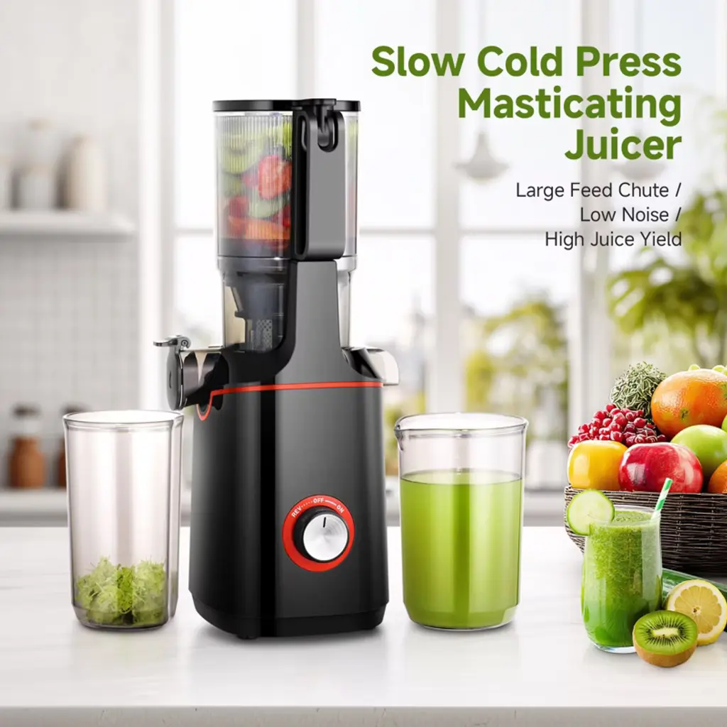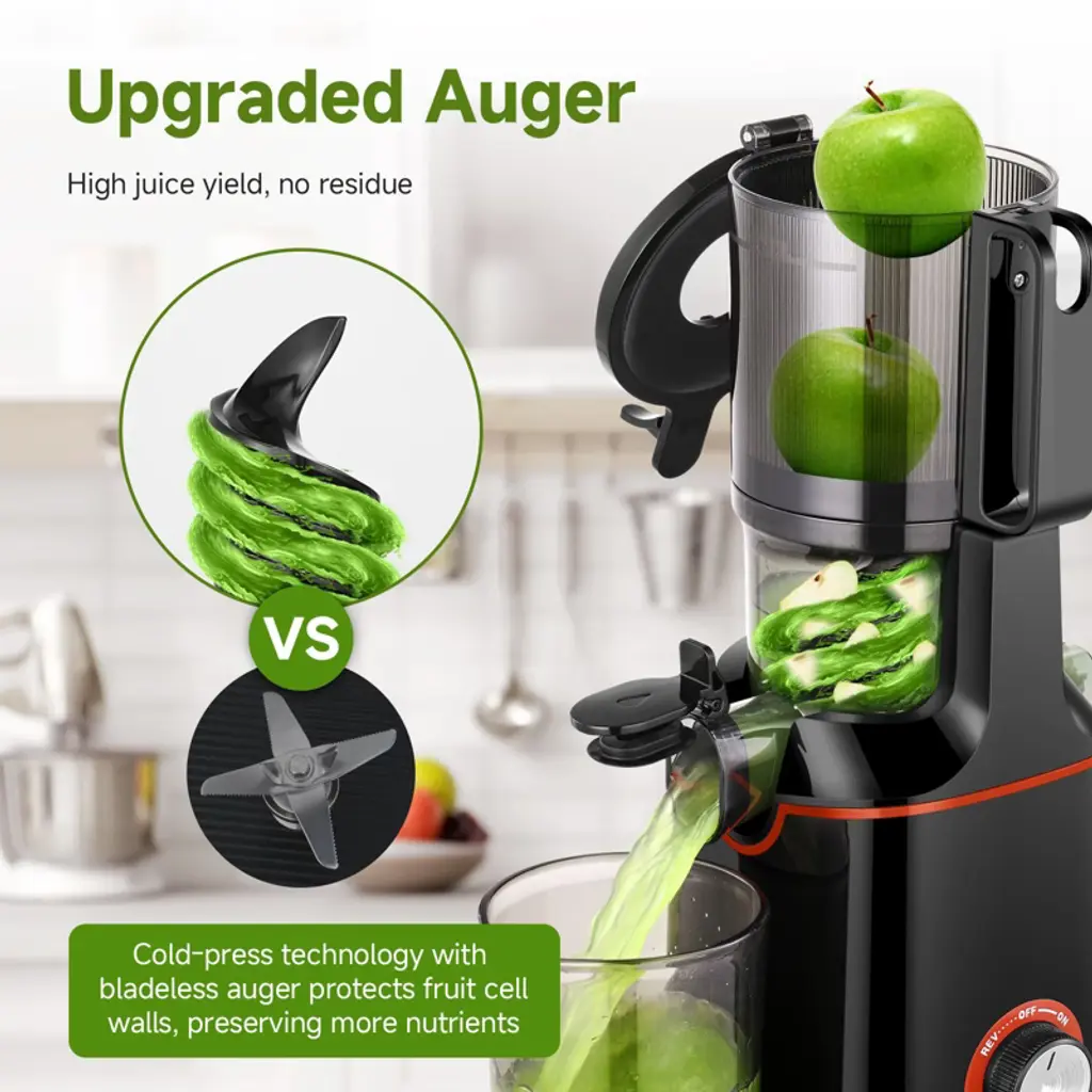 Effortless Juicing with the 108mm Wide Feed Chute Our juicer features an impressive 108mm wide feed chute that allows you to juice whole fruits without the hassle of pre-cutting. Whether it's a large apple or a whole orange, the juicer handles it all with ease, giving you the convenience you deserve. Upgrade Your Juicing Game with a 1500ML Capacity Maximize your juicing potential with the upgraded 1500ML capacity, perfect for blending multiple fruits together. Paired with a quiet, high-quality pure copper motor, it operates at a powerful 160W, effortlessly juicing up to 5kg of carrots in a single go without any blockage. Triple Stainless Steel Filtration for Pure, Smooth Juice Enjoy a perfectly smooth, pulp-free juice every time with our triple stainless steel filtration system. Featuring 2mm, 0.8mm, and 0.5mm mesh filters, the juicer ensures a fine, silky texture, eliminating all unwanted residue. Automatic Slow Spiral for Maximum Juice Yield Our upgraded automatic slow spiral efficiently extracts every last drop of juice, ensuring maximum juice yield from your fruits and vegetables. This advanced technology ensures optimal extraction without compromising on quality or taste.