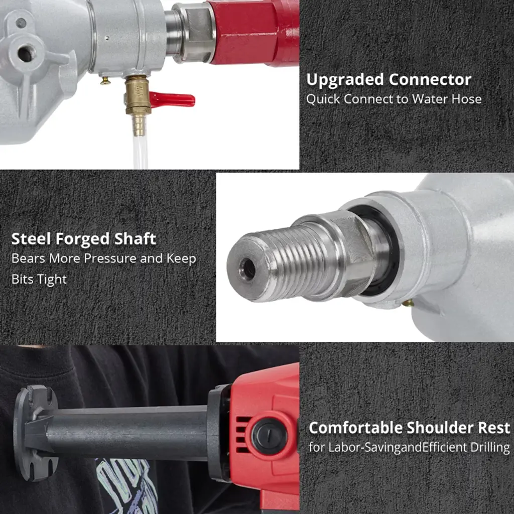 This core drill machine is engineered for drilling into various hard materials including concrete, asphalt, brick, and stone. Its 1500W motor delivers a speed of 1880 RPM, providing efficient performance for construction, renovation, and maintenance tasks. The unit supports wet operation with a supply hose to assist in drilling and dust reduction. An ergonomic non-slip grip helps maintain control and comfort during extended use. Built with durable components, the drill is suited for demanding job site conditions. It can be used for creating openings for pipes and electrical conduits in buildings, core sampling in roadwork, and other drilling applications in both residential and commercial projects.