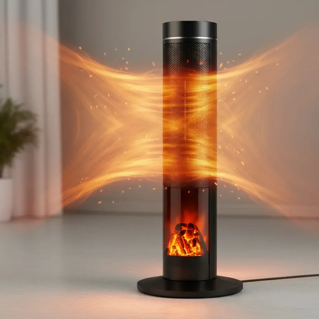 This Electric Space Heater is a portable, 1500W device that ensures your comfort and warmth. It features a digital LED display for easy monitoring and adjustments of heat settings. The heater comes with a remote control for convenient operation from a distance. Its unique 3D realistic flame effect adds a cozy ambiance to your room. The oscillating function aids in distributing heat evenly across the room. Safety is a priority with this heater, as it's equipped with a tip-over switch and overheat protection, both of which automatically shut off the heater when either it's knocked over or gets too hot.