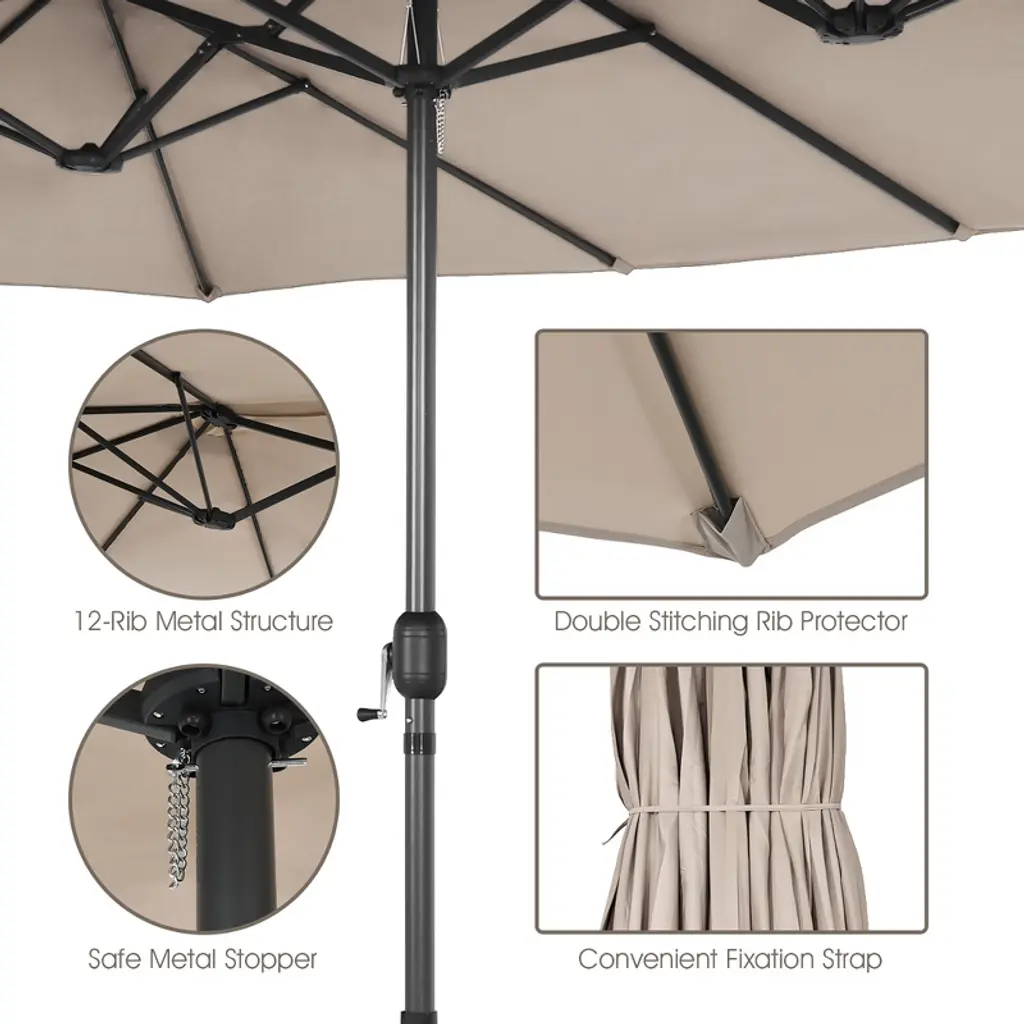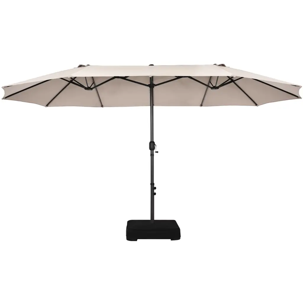 Enjoy leisure time with your family and friends under the shade! Measuring 15ft x 9ft, our double-sided umbrella provides a wide coverage of shade to allow several people getting together to chat under sunny days. Besides, the patio umbrella comes with sturdy metal structure and sun-protective fabric, which can ensure high durability and protection. And the bottom base is constructed with a crossed metal frame, 2 sand bags (a filled sand bag weighs 90lbs) and an external cover, so you don't need to buy an enhanced base additionally. Furthermore, this outside patio umbrella has user-friendly crank mechanism that helps you to open and close the umbrella with ease by rotating the crank handle. In a word, our patio twin umbrella is perfect for outdoor use, such as backyard, garden, poolside and fairground. FeaturesDouble-sided umbrella for ultra-large shading coverage Sturdy metal structure perfectly supports canopy Hand-crank technology for umbrella opening & closing easily 2 fully filled sand bags weigh 180lbs in total Includes a cross metal frame, 2 sand bags & an external cover Detailed instruction for quick assembly to save time and energy Practical umbrella blocks up sun light in patio, garden, outdoor market Color: Beige/Coffee/Grey/Orange/Navy/Turquoise/Wine Material: Steel, Polyester Fabric Overall Dimension:15 ft x 9 ft x 8.1 ft (LxWxH) Base Size: 2.4 ft x 2.4 ft x 0.5 ft Diameter of Umbrella Pole: 1.9'' Net Weight: 38.5lbs Package includes: 1 x Patio Umbrella 1 x Cross Base 2 x Sandbags 1 x External Cover 1 x Instruction