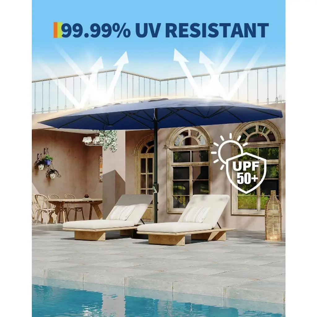 Enjoy the perfect outdoor shade with our 15FT Large Patio Umbrella, designed to comfortably cover 2-8 people with its oversized double-sided rectangular canopy. This umbrella features a durable metal cross base and two sandbags for superior stability, ensuring it stays secure even on breezy days. The convenient push-button tilt allows easy angle adjustment to block the sun as it moves, while the effortless crank lift system lets you open and close the canopy smoothly. Measuring 15 feet long by 9 feet wide, it provides a generous 135 sq ft of shaded space, ideal for patios, decks, pools, and backyard gatherings. Crafted from 100% polyester fiber with 180gsm thickened fabric, it offers excellent fade resistance, waterproof protection, and blocks 99.9% of harmful UV rays. Built to last, the umbrella features a strong 1.9-inch thick coated alloy steel pole and 12 sturdy ribs for enhanced durability and wind resistance. The safety buckle design on top ensures reliable support for this large outdoor umbrella. Perfect for creating a cool, comfortable, and stylish outdoor retreat all summer long.