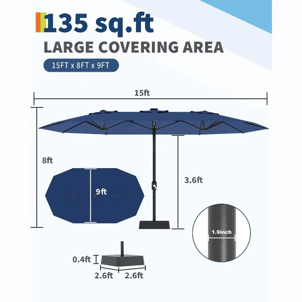 15ft Large Patio Umbrella With Base Included, Oversized Shade For 2-8 People, Double-sided Rectangle Umbrella, Weighted Base For Pool, Deck, Backyard