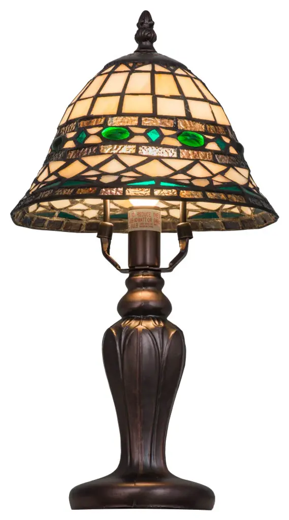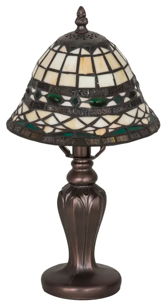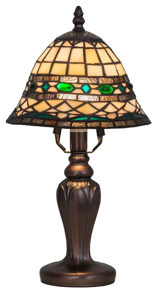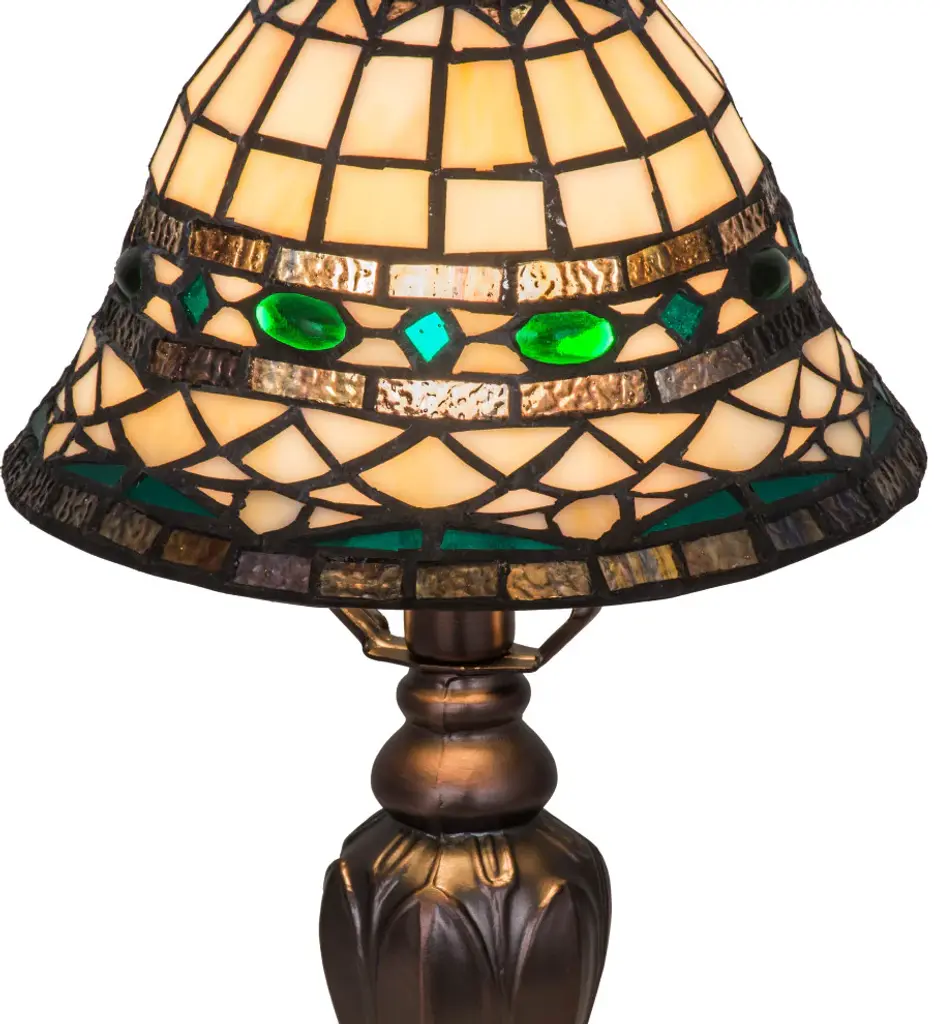 Emerald and Aquamarine colored jewels and Multicolored granite glass bands accentuate this elegant Amber Beige art glass reproduction of a famous Louis Comfort Tiffany design. This Roman styled shade is inspired by Italian art and architecture and is handcrafted of authentic stained glass by artisans using the famous Meyda Tiffany copperfoil construction method. The shade is perched on a decorative base featuring a warm; hand applied Mahogany Bronze finish. Custom colors; styles and sizes are offered; as well as dimmable energy efficient lamping options such as LED. The lamp is UL and cUL listed for dry locations.