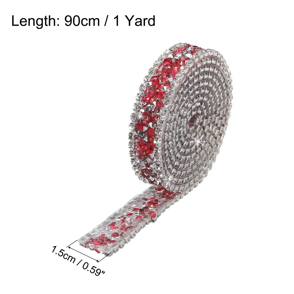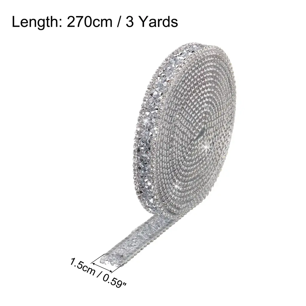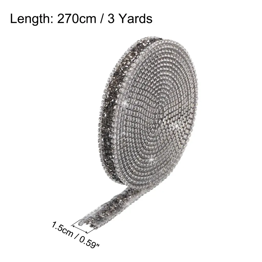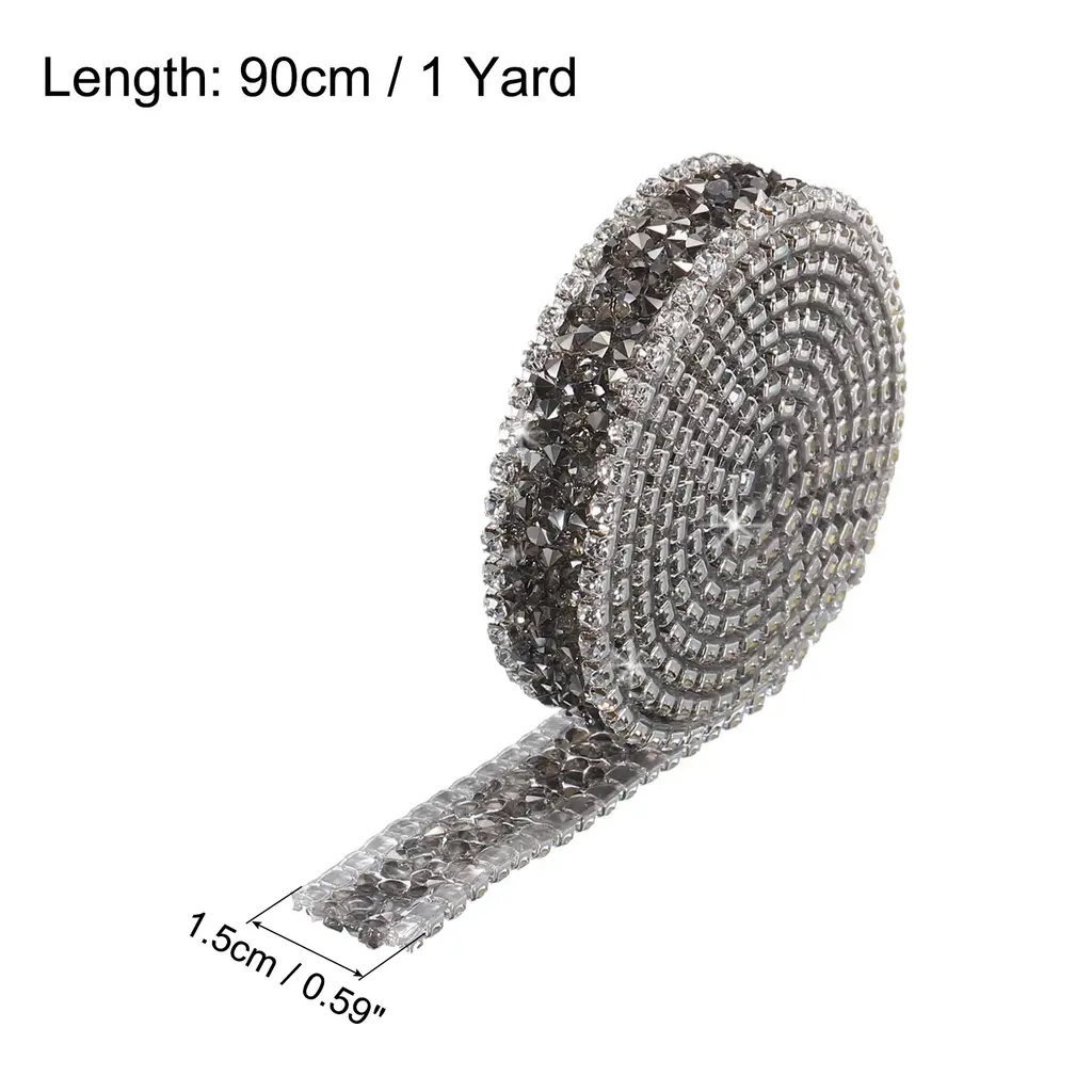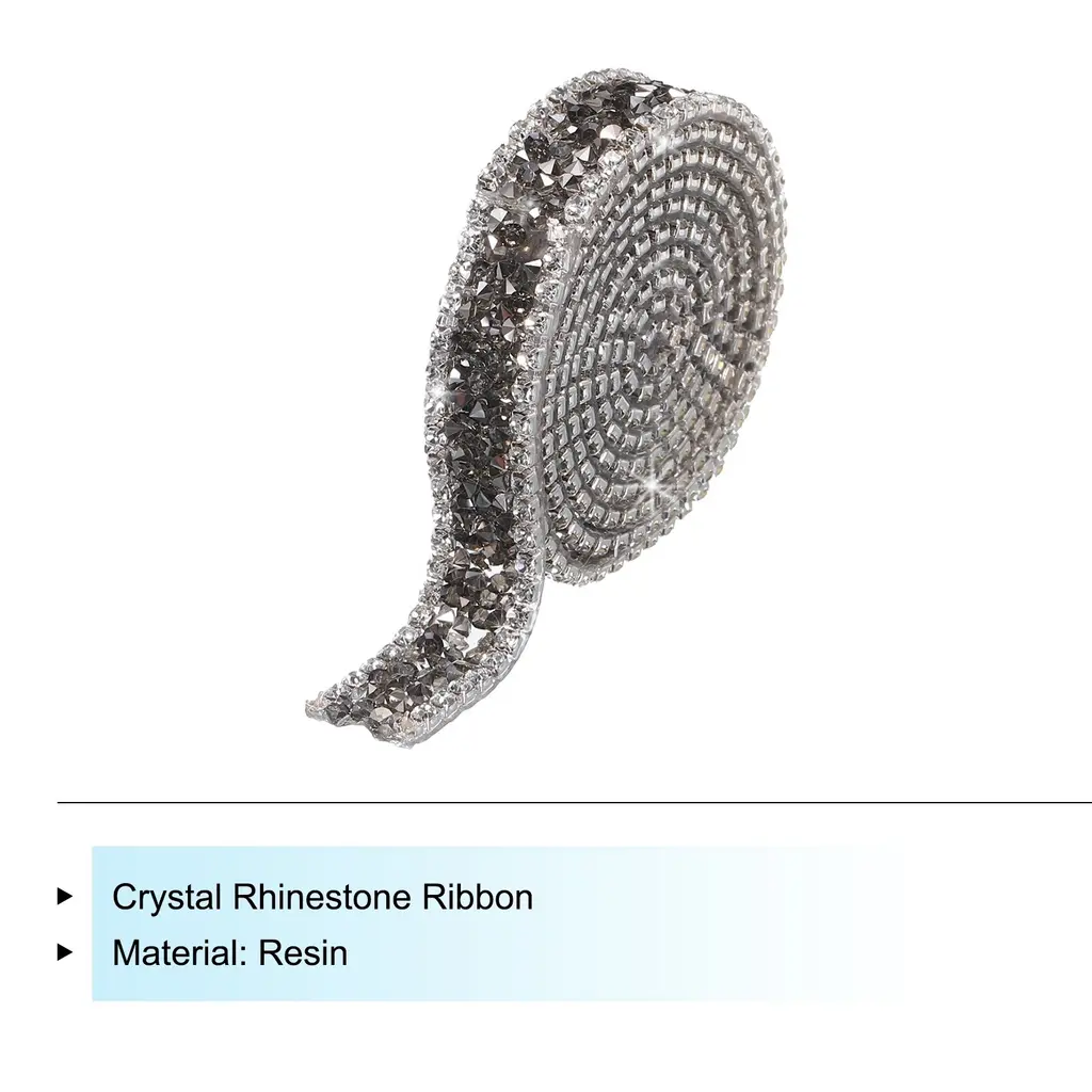 What is this?Rhinestone diamond ribbon can mainly be used to decorating wedding or birthday and holiday party. You can use it for decoration of different style clothing, such as stage performance clothing, traditional clothing, Wedding Bridal Dress, and can also be used to DIY various hair accessories, shoes , belts, bags, cake decoration etc., and you can also use it for decoration on different parties.What will I get?Color: Black GrayMaterial: ResinTotal Size: 1.5cm x 90cm/0.59 inch x 1 Yard (W*L)In the package of: 1 Roll x Crystal Rhinestone Ribbon Are there any advantages of the product?1. This rhinestone diamond sticker is made of resin, using good craftsmanship to make all the surfaces shine, smooth and flat, and they are bling no matter under natural light or light.2. The resin diamond ribbon has transparent hot melt adhesive, it cannot be pasted directly on the surface of the item. use an electric iron or a heat press to heat the hot melt adhesive3. The bling rhinestones trim hot melt adhesive the adhesive performance is stable are not easy to fall off, You can use it to easily stick to the surface of the dress, or to stick to the surface of other itemsHow to use it?1. put it on the clothing you want to decorate, Then heat the hot melt adhesive melt and fix with an electric iron or a heat press2.If you don't have an electric iron or a heat press, you can stick double sided adhesive on the bottom of this ribbon, and you can stick it directly on the surface of the item you want to decorateWhat should I notice?Within 48 hours of use, do not let the craft come into contact with liquids.It cannot be used on the surface of items that are easily deformed due to temperature
