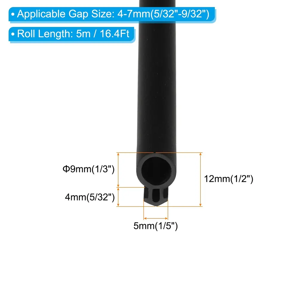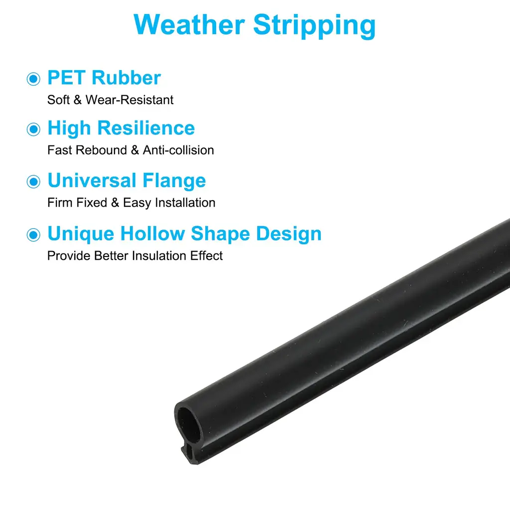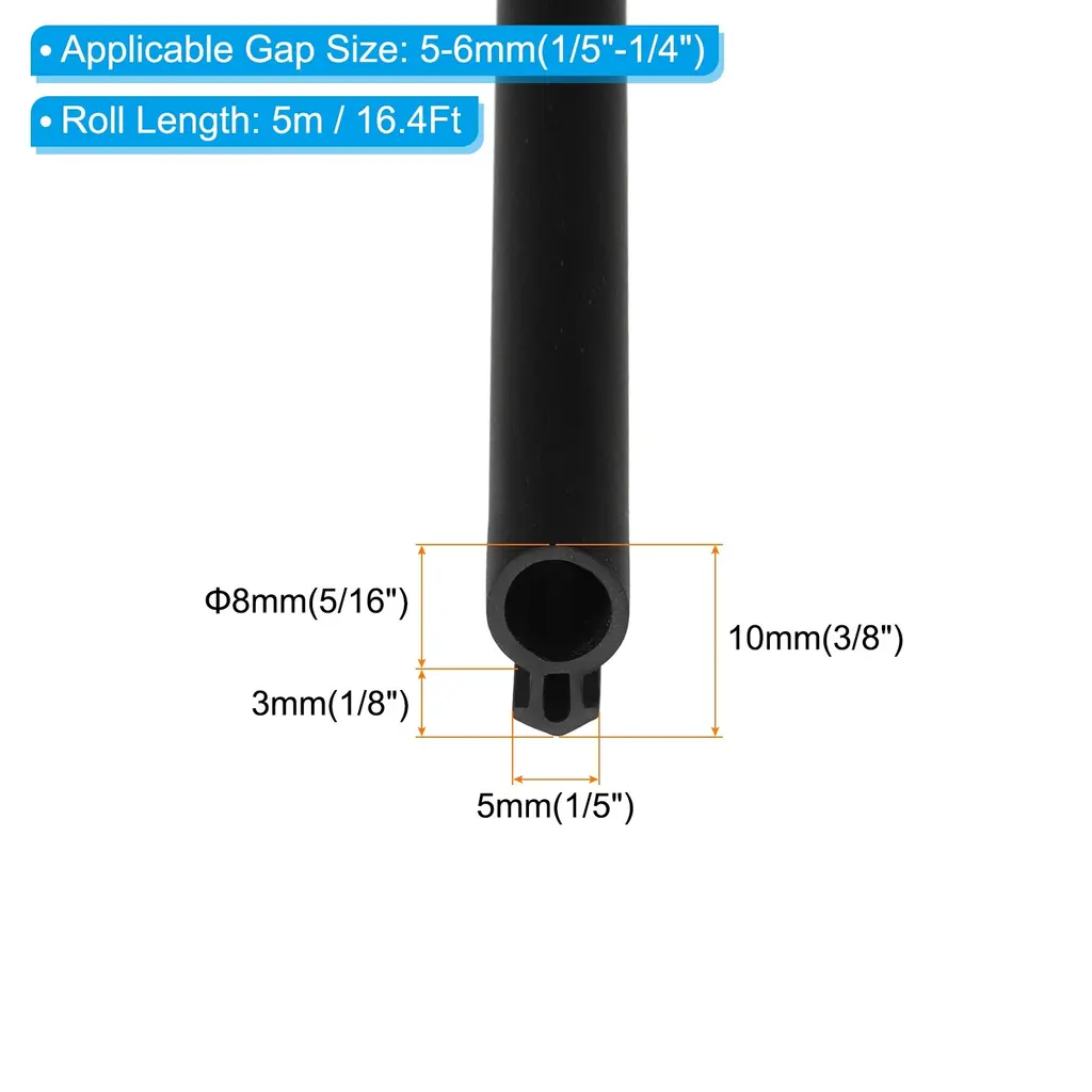 Our door weather stripping is widely used in door frames, and large gaps for sealing purpose, it can reduce heat loss while keeping dust and noise out for your home, providing you a quiet and comfortable environment. In addition, it can reduce collision and wear on window/door while opening and closing.The door draft stopper is suitable for various types of sliding window, doors, or swing doors, such as security doors, patio doors, glass doors, balcony doors, wardrobe doors, cabinet doors, etc.SpecificationMaterial: TPE RubberColor: BlackRoll Length: 5m/16.4FtBulb Bubble Diameter: 8mm/ 5/16"Kerf Size: 3 x 5mm/ 1/8 x 1/5inch (LxW)Height: 10mm/ 3/8"Applicable Gap Size: 5-6mm/ 1/5"-1/4"Package List: 1 Roll x Door Weather StrippingAdvantageOur door weather sealer is made of PET rubber, is wear-resistant, not easy to tear and deform for durable use. Soft to easily bend different shapes for required use. door weather sealer has high resilience, quick rebound after pressing, effective anti-collision, and reducing impact. Unique shape design fits the door seam better, flange part is hard enough to catch the slot for easy installation, providing a better sealing effect for insulation, windproof, soundproof, dustproof, etc.InstructionThe unique design of our weather stripping supplies a good fit into the slot channel. The unique design of our weather stripping supplies a good fit into the slot channel. Use the screwdriver to pry out the old door sealing strip, and press our door sealing strip directly into the installation slot. To used as replacement seals on old door frames, window, etc.NOTE1. After receiving our products, please place the sealing strip in a dry and ventilated place first2. Please check the size before purchasing.