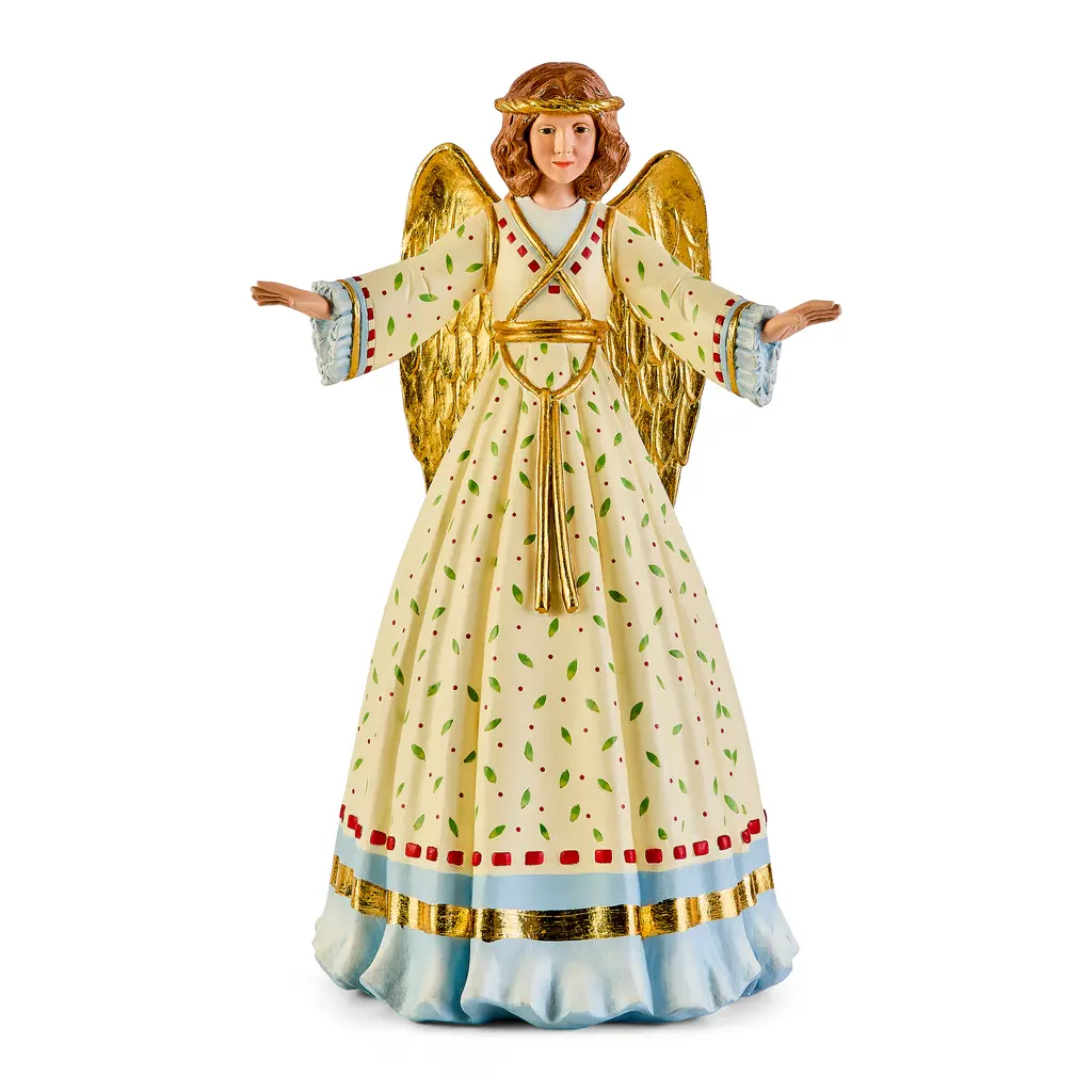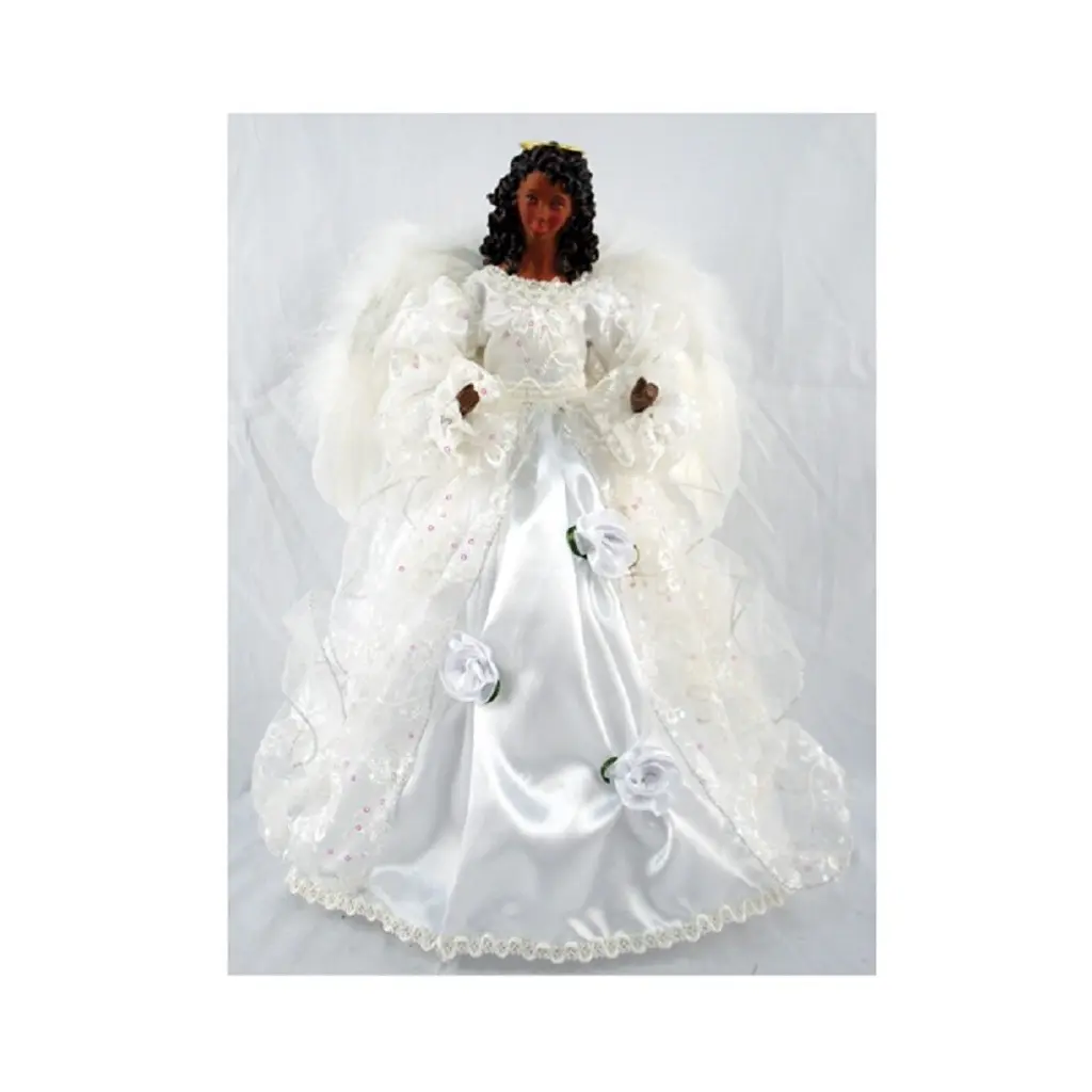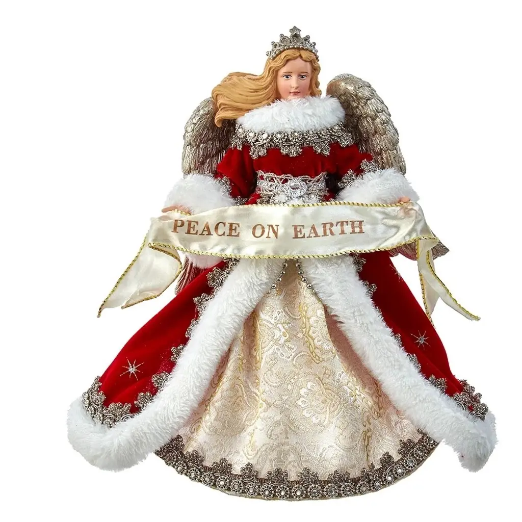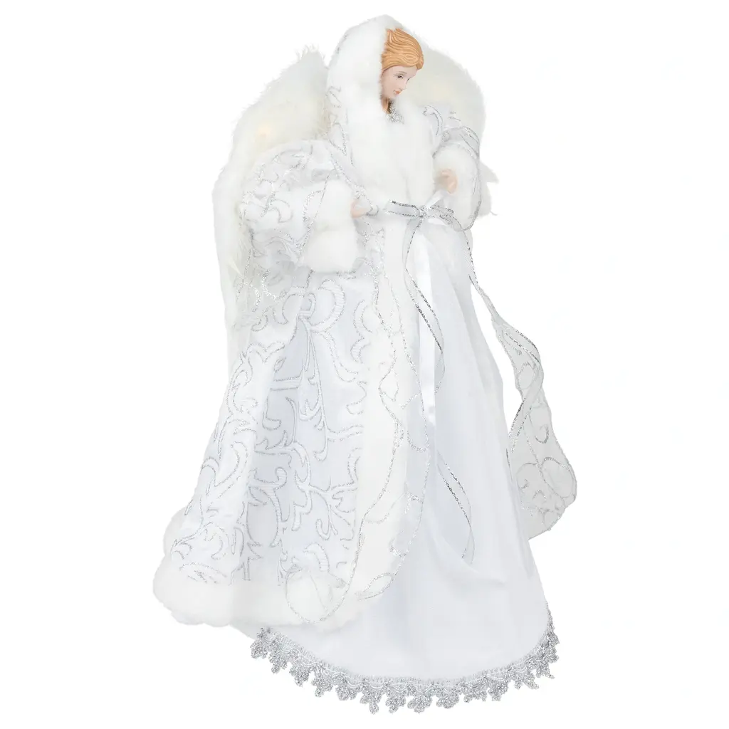 Complete the enchantment of your Christmas tree with this angel tree topper. This exquisitely crafted angel adds the perfect finishing touch to any tree, showcasing a cream colored textured gown with golden thread and silver wings while holding a harp. Handcrafted with attention to detail, this elegant tree topper, made from durable porcelain and featuring beautiful handpainted details, will bring joy to your holiday celebrations for years to come. Product Features: Silver and white angel tree topper for Christmas perfection Unlit Cream colored textured gown interlaced with golden thread for sophistication Silver wings and harp celebrate the elegant holiday aesthetic Intricate and beautiful hand painted details for a stunning appearance Spiral cone makes for easy attachment to the tree Recommended for indoor use only Dimensions: 16"H x 13"W x 8"D Material(s): porcelain/polyester