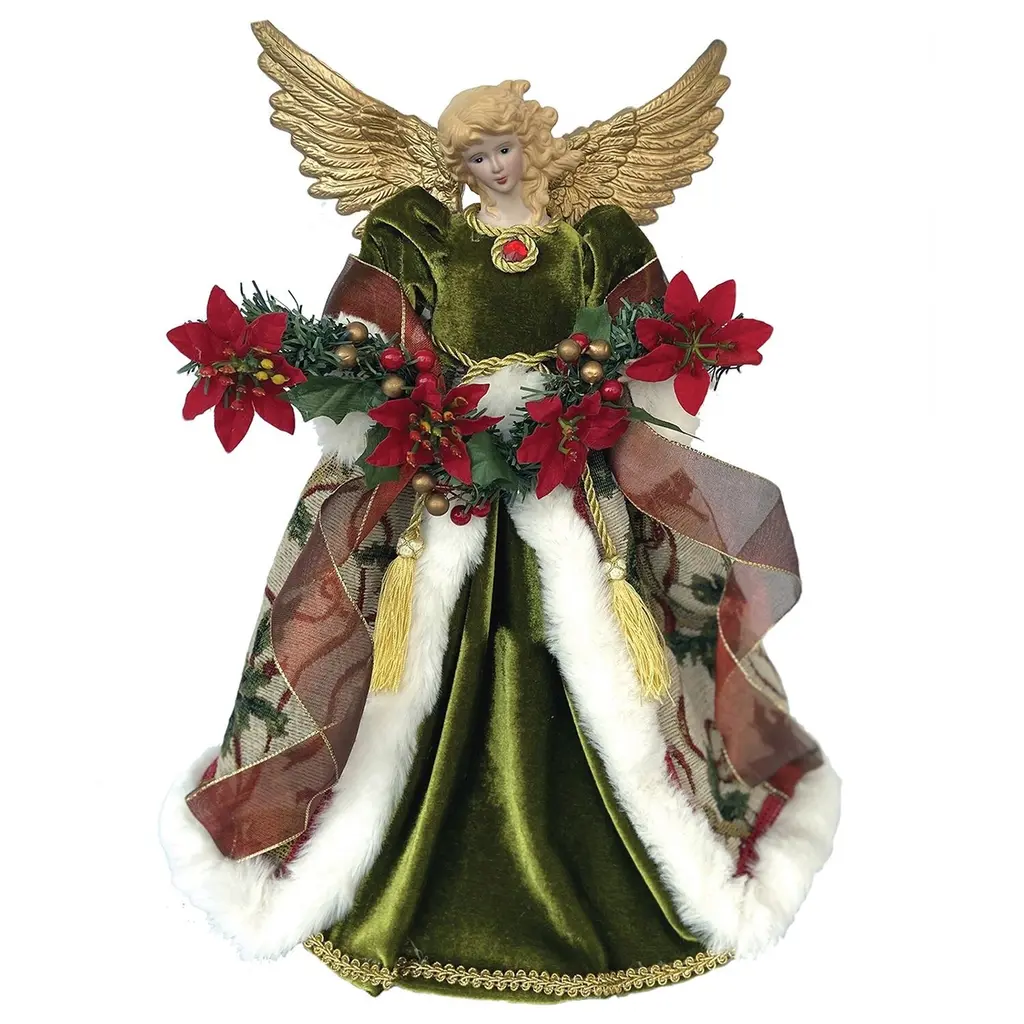 Add the perfect finishing touch to your Christmas tree with this exquisitely detailed cardinal angel tree topper. This cardinal angel wears a faux fur trimmed green and red gown and feathered wings. She holds a charming red cardinal, capturing the spirit of the holiday season. With beautiful hand painted details and a hand stitched gown, this elegant tree topper is a must have for stylishly decorating your holiday home year after year. Product Features: Cardinal angel Christmas tree topper Unlit Accented with pinecones, berries, feathered wings, and a red cardinal Wearing a faux fur trimmed green and red hand stitched gown Suitable for indoor use only Dimensions: 16"H x 11"W x 6"D Material(s): porcelain/polyester