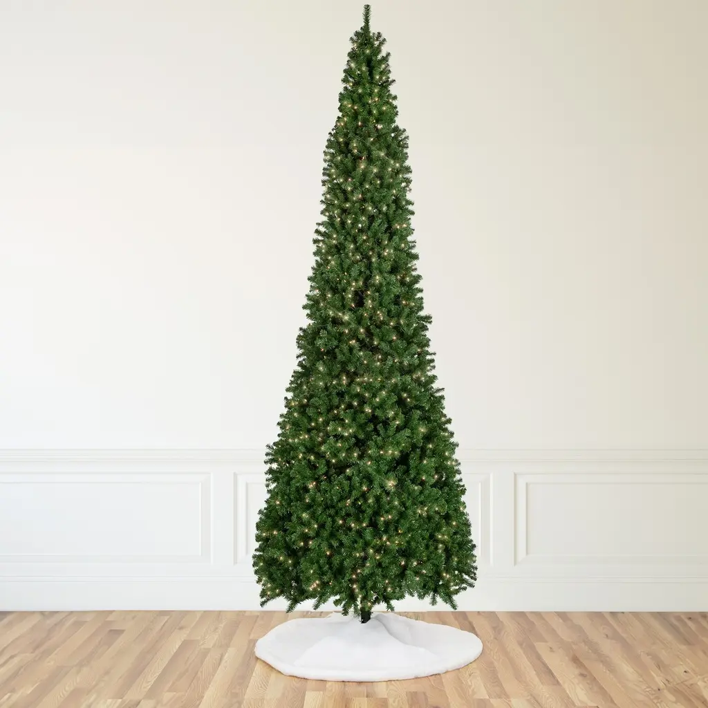 Make a statement with our 16-foot Pendleton Spruce artificial Christmas tree. Tall in stature but a slim silhouette make it perfect for those with limited space who are still looking for something grand. It comes with medium green foliage on tiered hinged branches forming a slender profile that saves space and complements any decorating theme. Pre-strung with clear incandescent mini lights that give a soft warm glow for that timeless look. Leave as-is or enhance it by showcasing some treasured holiday ornaments. Product features: Pre-lit with 1800 clear lights. Bulb size: mini. Bulb type: incandescent. 6706 branch tips. 2" wide tips. 72" green lead cord. 7-piece easy assembly (including stand). Slim profile tree. Additional product features: Hinged branch construction. UL certified and approved for indoor use only. If one bulb burns out the rest will stay lit. Lights are equipped with Lamp Lock feature which makes them replaceable interchangeable and keep them from falling out. Comes with replacement bulbs and spare fuses. Includes a sturdy metal tree stand. Wire gauge: 22. 120 volts 60 hertz. Dimensions: 16' high (from the base of the stand to the top of the tree). 72" base diameter (at the widest point). Material(s): PVC/metal/glass bulbs/wire. Note: Branches are compressed for shipment and need to be fluffed out upon arrival to look like the photo.