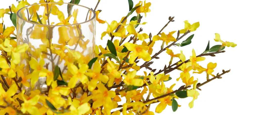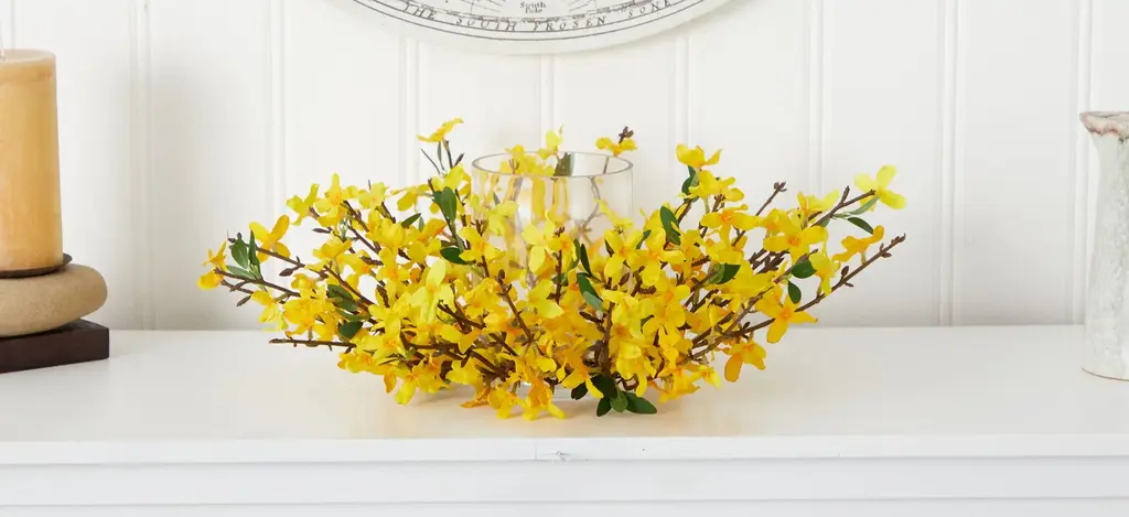Brighten your space with a sunny 16in Artificial Forsythia Candelabrum. Crafted from high-quality materials, wispy, artificial yellow blooms surround a light candle holder, perfect for setting the mood in any space. Inspired by nature, the flowers are incredibly lifelike and will last longer than a fresh bouquet. With a length of 16", display in any table top. Perfect for a dining room, coffee table or an office. Silk arrangements are manufactured using synthetic materials, such as polyester material or plastic, and are well designed and constructed to be life-like in appearance. This item will need to be re-shaped when removed from the secure box to allow it to reach its fullest size. Your artificial arrangement will look beautiful for years to come; simply wipe clean with a soft dry cloth when needed.