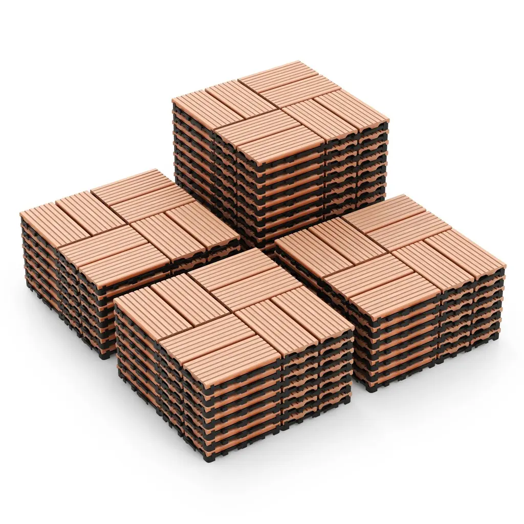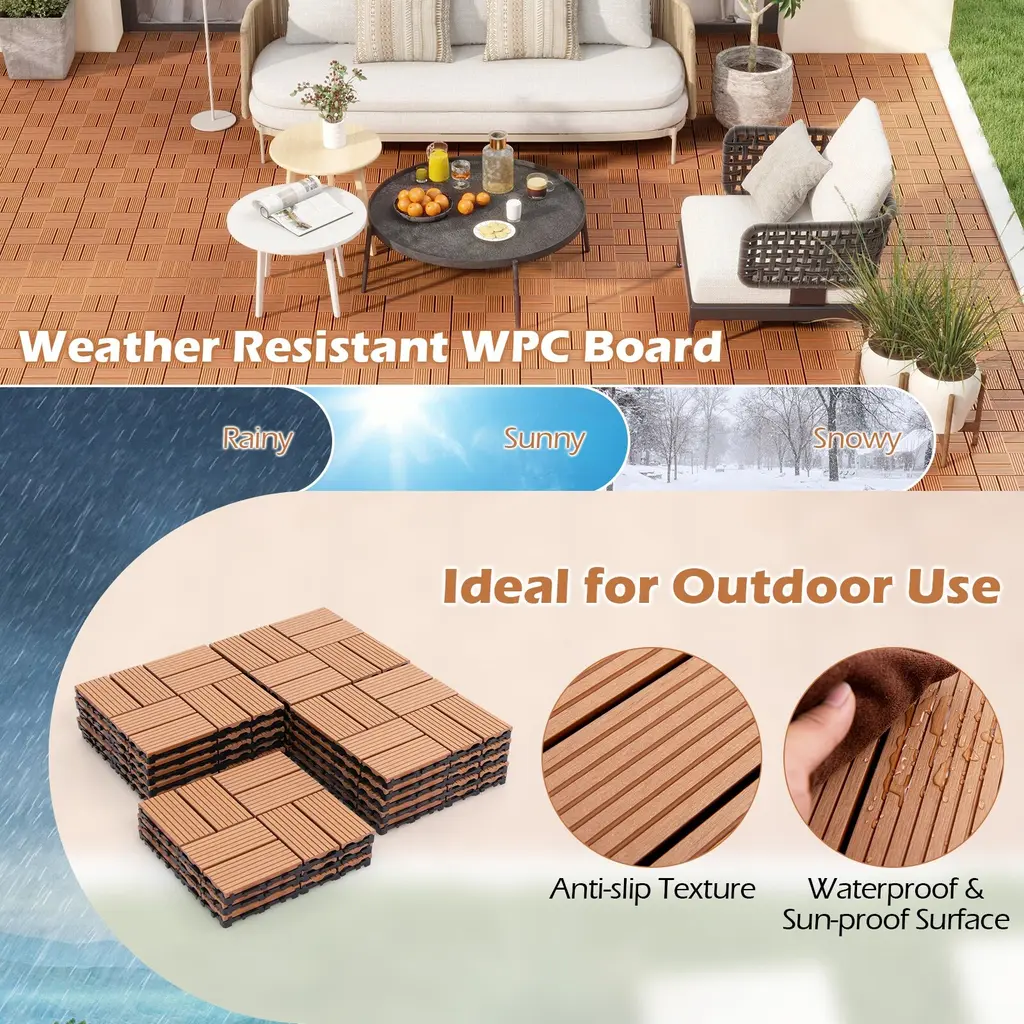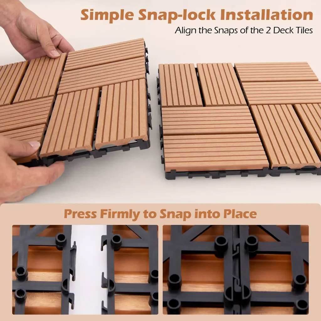 Specifications:Description:These upgraded deck tiles, made from weather-resistant WPC board with a PP bottom, boast a service life four times longer than ordinary plastic wood, withstanding sun, rain, and snow without warping. They feature a simple snap-lock installation: just align and press to connect, and the easy-to-cut design allows for a customized fit. The non-slip surface enhances safety, making them ideal for poolside or other slippery areas. With a natural wood finish and multiple splicing methods, this pack of 18 tiles is versatile for patios, porches, balconies, backyards, gardens, and poolside settings. They are also easy to maintain, with waterproof, sun-proof surfaces that resist fading and a slatted design that promotes good drainage.Key Features: