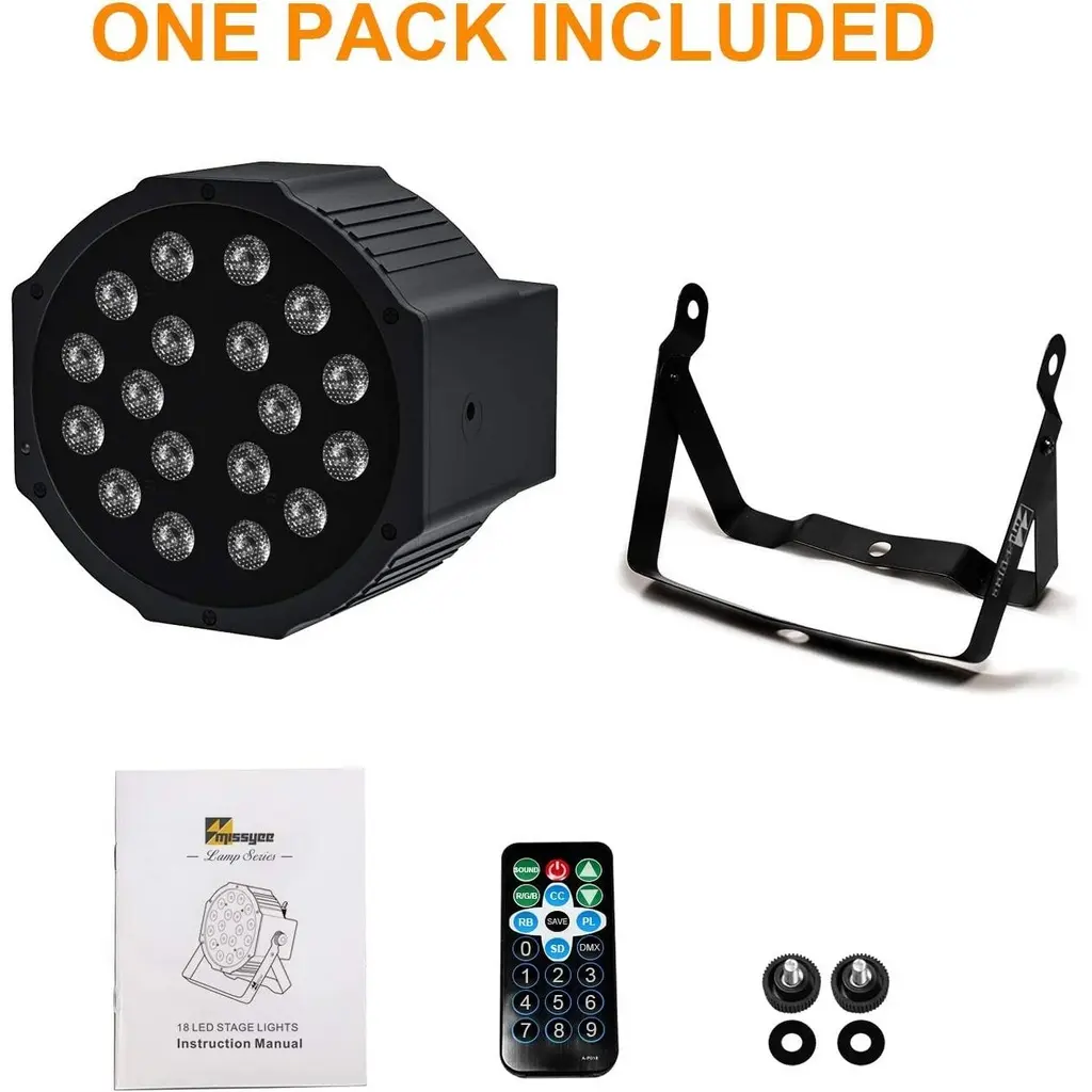 Missyee 18 RGB LEDs Stage Light is Made Up with High Power Top Grade LEDs . With High Brightness, Low Power Consumption and Bright Color, All Led Lamp Quality Steady And Lifetime Up to 100000 Hours, And Energy Saving, Light Coverage Wider. 1-2 Pieces par can light up 30-40 square meters. Features: