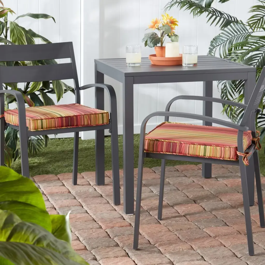 Add both comfort and style to your outdoor seating with this set of 2 square chair pads from Kensington Garden. A dense fiberfill insert gives this cushion a smooth finish, and eliminates any shifting for a more consistent comfort. Our durable outdoor polyester fabric resists fading, repels water, stains and spills, and is available in a wide variety of colors and patterns. Use with other KG cushions and pillows for a coordinated look. To prolong the life of our cushions and keep them looking beautiful, we recommend storing them indoors or covered when not in use.