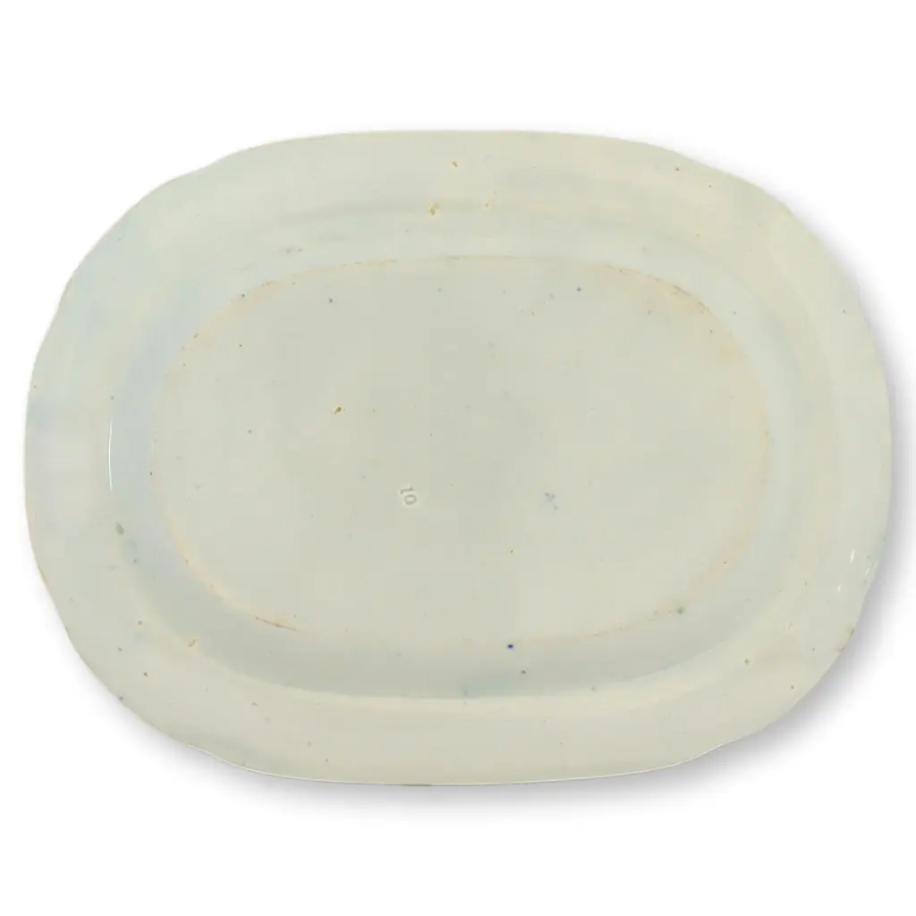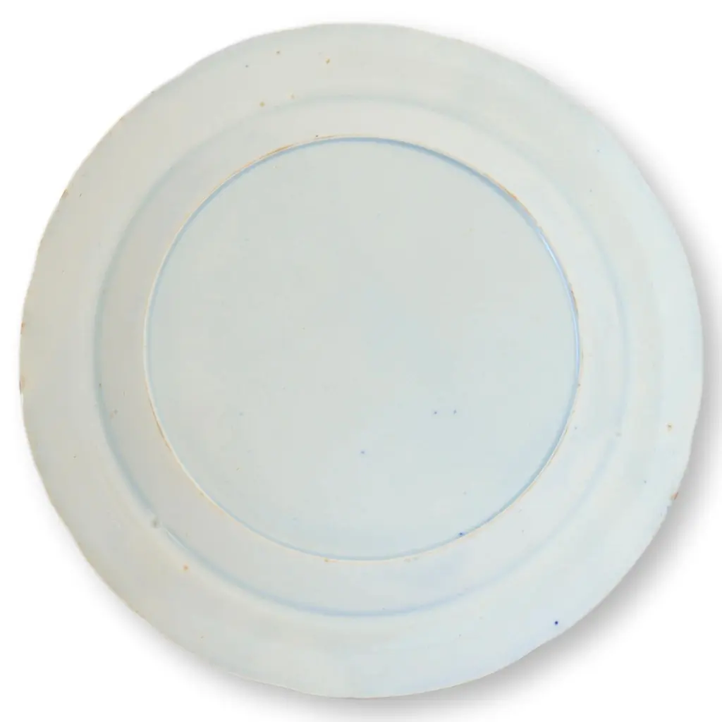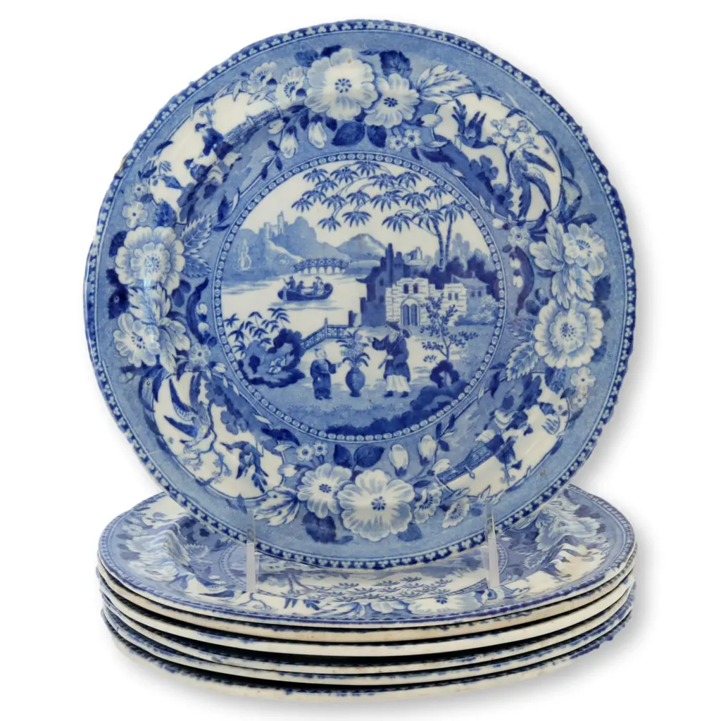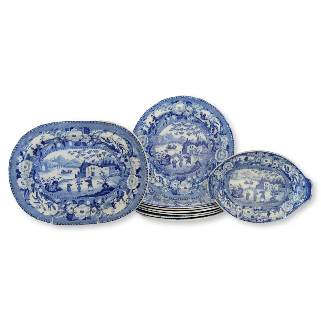 Eleven piece English pearlware dinnerware set. Made circa 1820s. It is a rare pattern known by collectors as "Chinese Flowering Pot", also known as "The Gardener". Earthenware pottery with Pearlware glaze. Dimensions: 7 plates, 8.75"Dia x .5"H; lidded bowl, 8.25"L x 8.25"W x 7"H; square bowl, 8.75"L x 8.75"W x .1.75"H; large oval bowl, 11"L x 8"W x 1"H; small oval bowl, 8.5"L x 6"W x 1.5"H. No maker's mark.