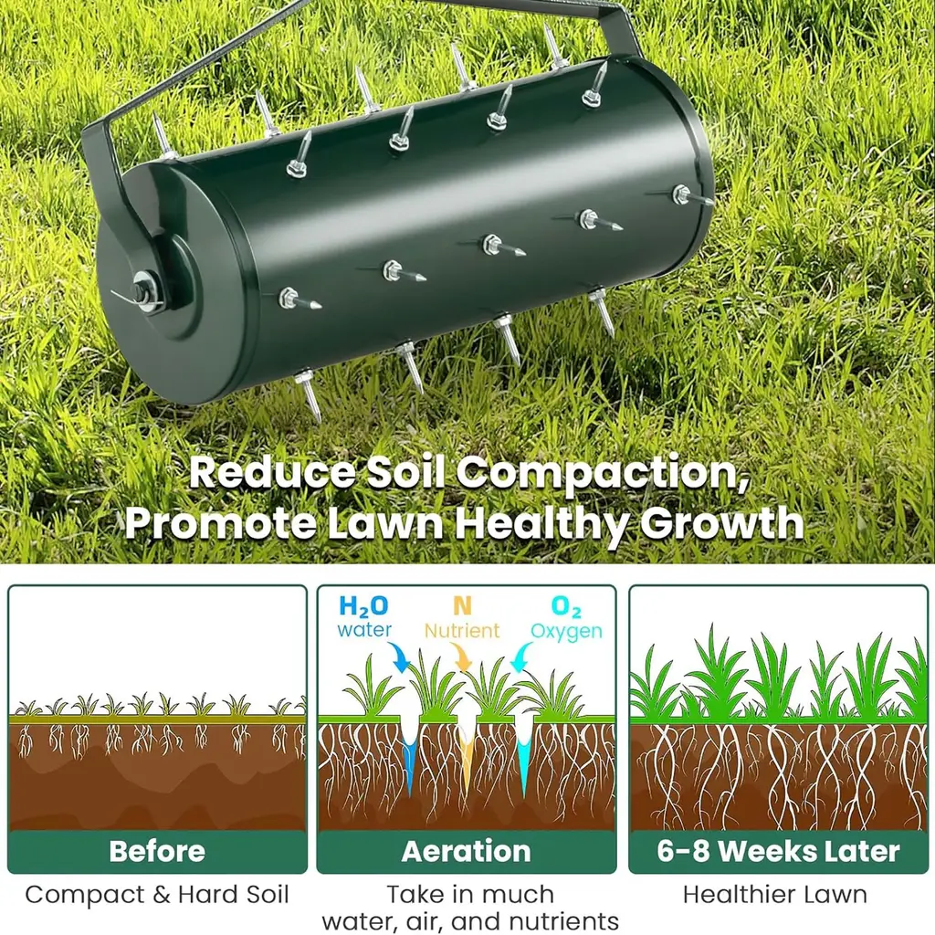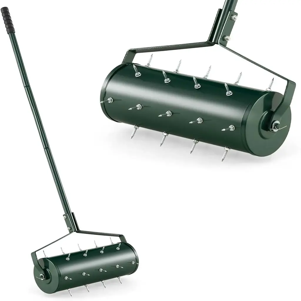The Effective Tool for Maintaining a Healthy Lawn! Our lawn aerator measures 18" x 5.5" x 51"/21" x 5.5" x 51" (L x W x H). It is designed to reduce soil compaction and facilitate the entry of air, water, and nutrients into the soil, promoting healthy root growth and lush green grass. Featuring multiple sharp tine spikes that are strategically placed, this rolling lawn aerator could efficiently penetrate various types of soil and deliver maximum aeration. You can also add sand or stones to the drum for added weight and stability. Additionally, it boasts a sturdy powder-coated metal frame that ensures its longevity even when exposed to outdoor elements. For added convenience, the aerator is equipped with a comfortable gripping handle, allowing you to maneuver it with ease. Invest in this essential tool and enjoy a vibrant and flourishing lawn. Features:Specification