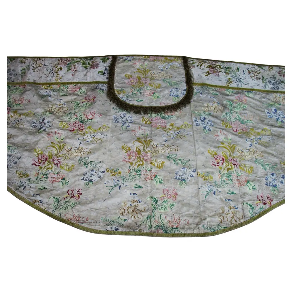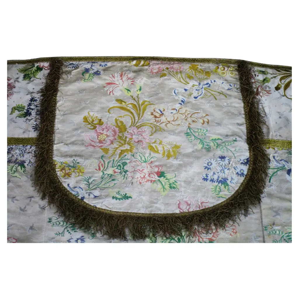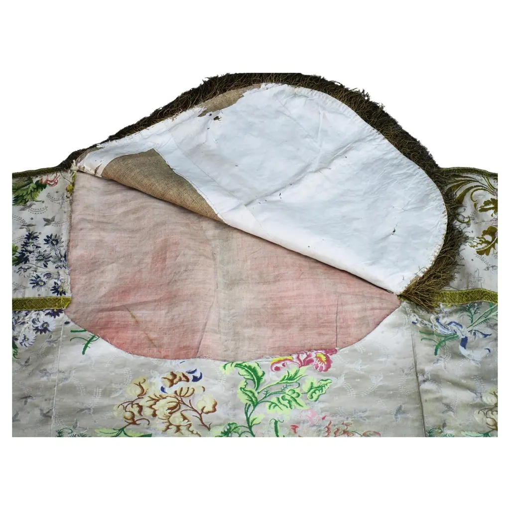 18th century French chasuble ( cope / liturgical vestment ) hand embroidered silk / metallic gold thread / linen. A deaccesion from the Memorial Art Gallery Rochester, NY. Overall good original antique condition w/ beautifully aged soft old colors. Measures 109 inches wide x 53 inches high x 1/8 inch thich. Look at all pictures and read condition report in comment section.