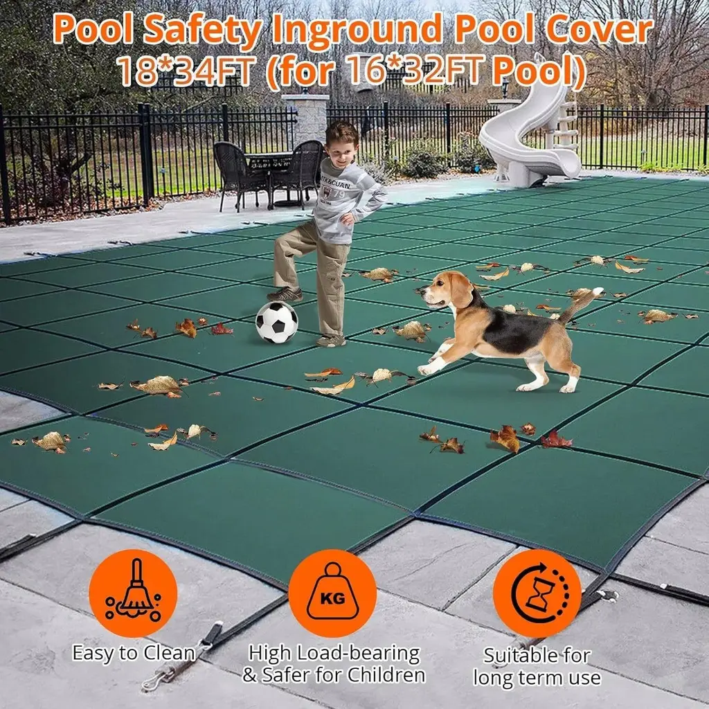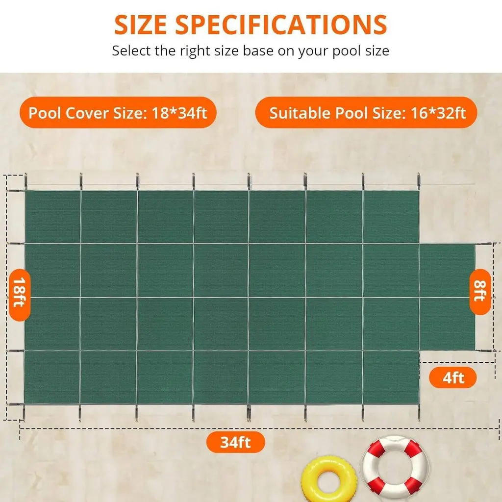 Density PP Material: We use ultra-high density polypropylene material and stainless steel fittings, which are fixed by brass ground spikes to keep the pool safety cover firmly on the pool to protect your family's safety. The durable material is able to withstand various weather conditions without requiring frequent replacement and maintenance.For Longer Use: the ends of the webbing used to hold the cover in place are crimped with metal to prevent the webbing from unraveling; adhesive strips are added to the bottom of the webbing that comes into contact with the ground around the pool cover to prevent long-term wear and tear.A Reliable & Durable Pool Cover: the pool safety cover is different from ordinary plastic safety covers floating on the water surface; it can securely cover the pool using ground nails, effectively preventing debris and keeping the pool water clean, while also preventing pets and children from accidentally entering, reducing potential safety hazards.400LBS Gravity Resistance: Our pool cover can withstand temperatures as low as -10 degrees Fahrenheit (-23 degrees Celsius), so you don't have to worry about using it in any area. A properly installed pool cover can withstand a minimum weight of 400 pounds, fully capable of withstanding snow, debris, gravel, pets and childrenAbout Installation : This pool cover measures: 18*34ft w/4*8FT Step, Suitable for pool size16*32ft . Choose the size of the cover according to the size of your pool, make it 2ft more on each side so that it can cover your pool completely. This pool safety cover is designed to be solid with no gaps or loose ends. In summer you can remove the safety net and easily fold it for storage.