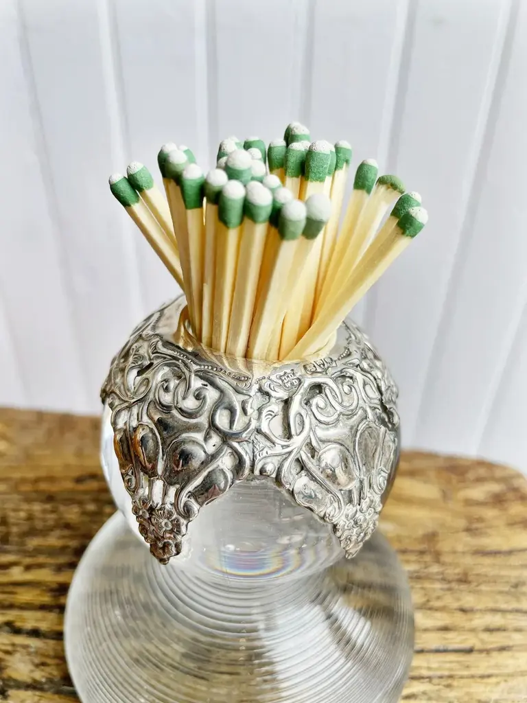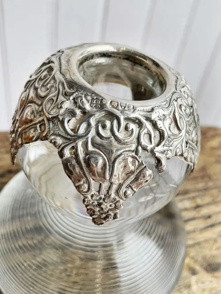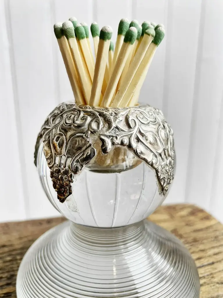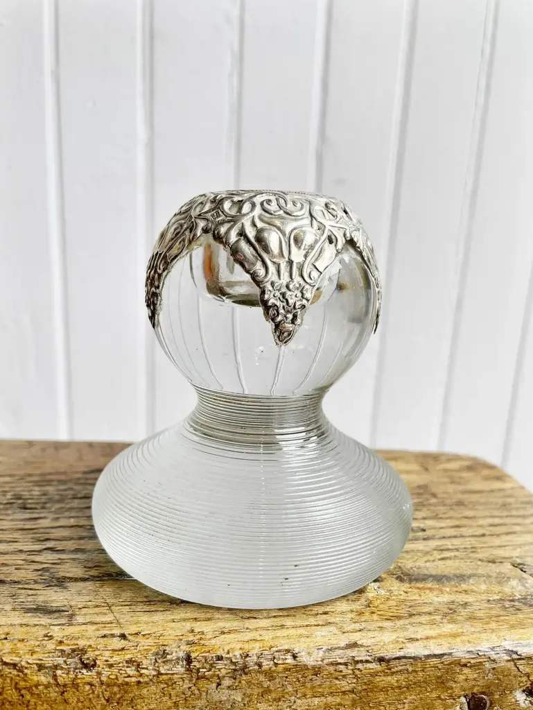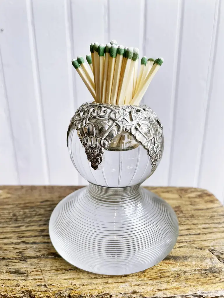 A lovely antique circa 1902 English glass match striker with sterling silver rim in a unique shape. Excellent antique condition, just some small signs of age and use, a few small flea bites to the ribbed glass. There is some loss to one decorative edge of the sterling rim. Full hallmarks for Sterling Silver, assayed in Chester in 1902. Measures a bit over 3.5” tall by 3.5” wide at the base.