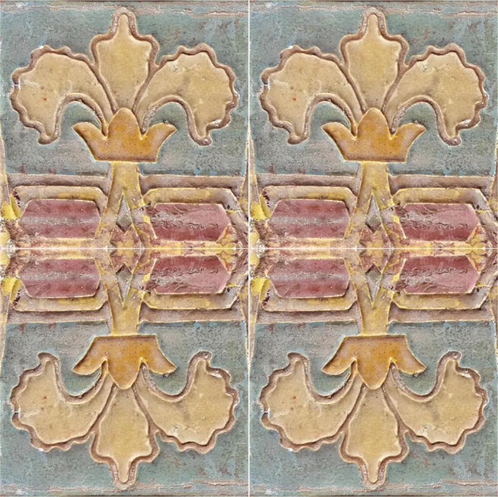 Reclaimed 1920's Early-California tile. 4" x 4" blue, yellow red and white fleur de list deco / border tile. Reclaimed from one of Coronado Island's historic estates, originally designed by renowned architect Richard Requa. 7 pieces available.