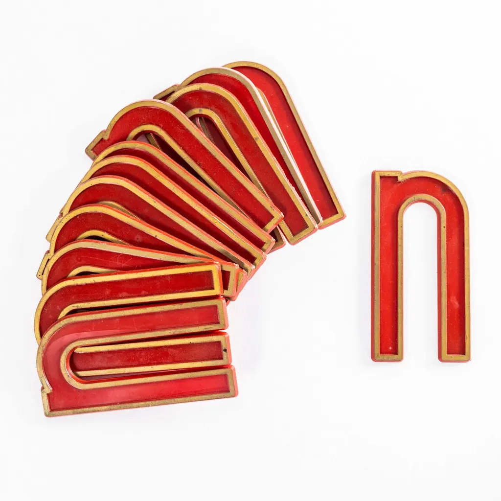 1930’s English Marquee Cinema Letter – N. Classic English cinema letters used at cinemas as signage for the film title, actors and so on. Made in acrylic plastic they slotted into tracks on the billboard. The term marquee comes from the French word Marquise, a name given by French soldiers in the 17th Century to a large fabric tent, and then adopted to cover the ‘tent’ like entrance over the entrance to cinemas and theatres. Listing is for one letter as shown. Judging by the condition, these are new old stock or certainly rarely used.Workshop Report:Our workshop team inspect every product and carry out any needed repairs to ensure that everything leaves us serviced and maintained ready for many more years of life. All of our vintage products show the rich beauty and history of their life with the knocks and bumps of many years of use and we try to minimise restoration to keep every piece as original as possible.Date:1930'sMaker:Industrial Production – EnglandDimensions:5.5cm(w) x 10.5cm(l) x 0.2cm(h)