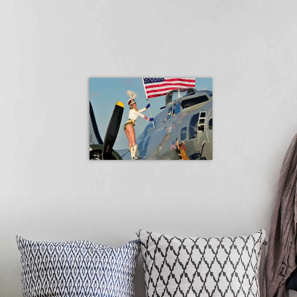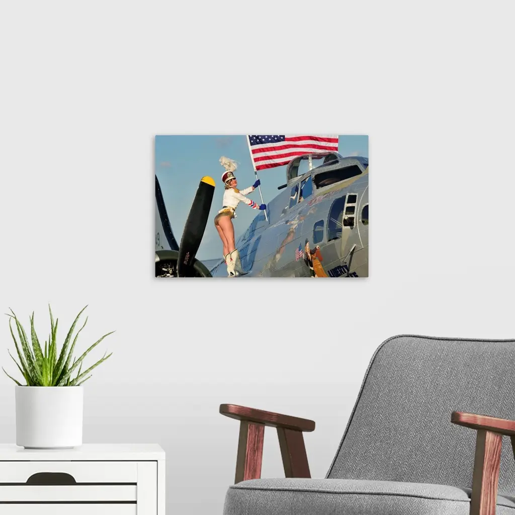 1940's Style Majorette Pin-Up Girl On A B-17 Bomber With An American Flag