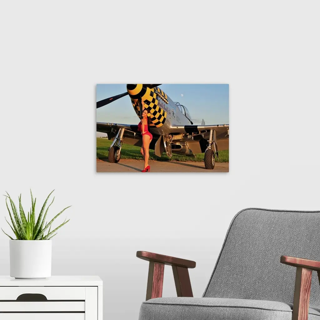Sexy 1940's style pin-up girl posing with a P-51 Mustang fighter plane.