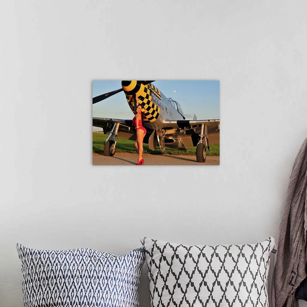 1940's Style Pin-Up Girl Posing With A P-51 Mustang