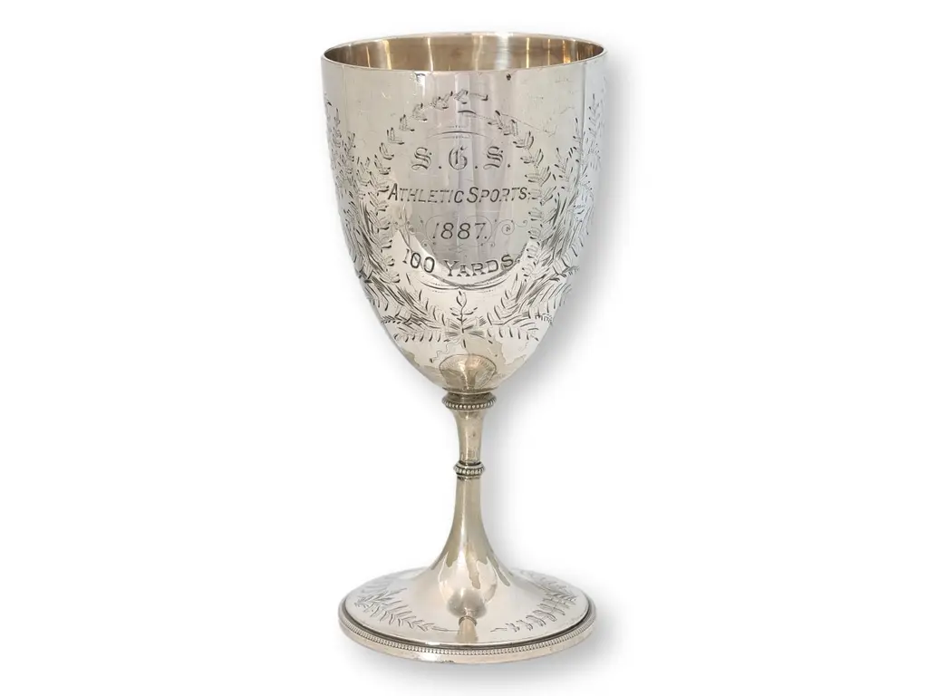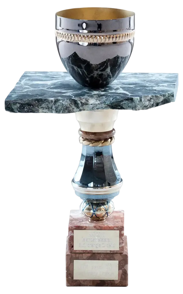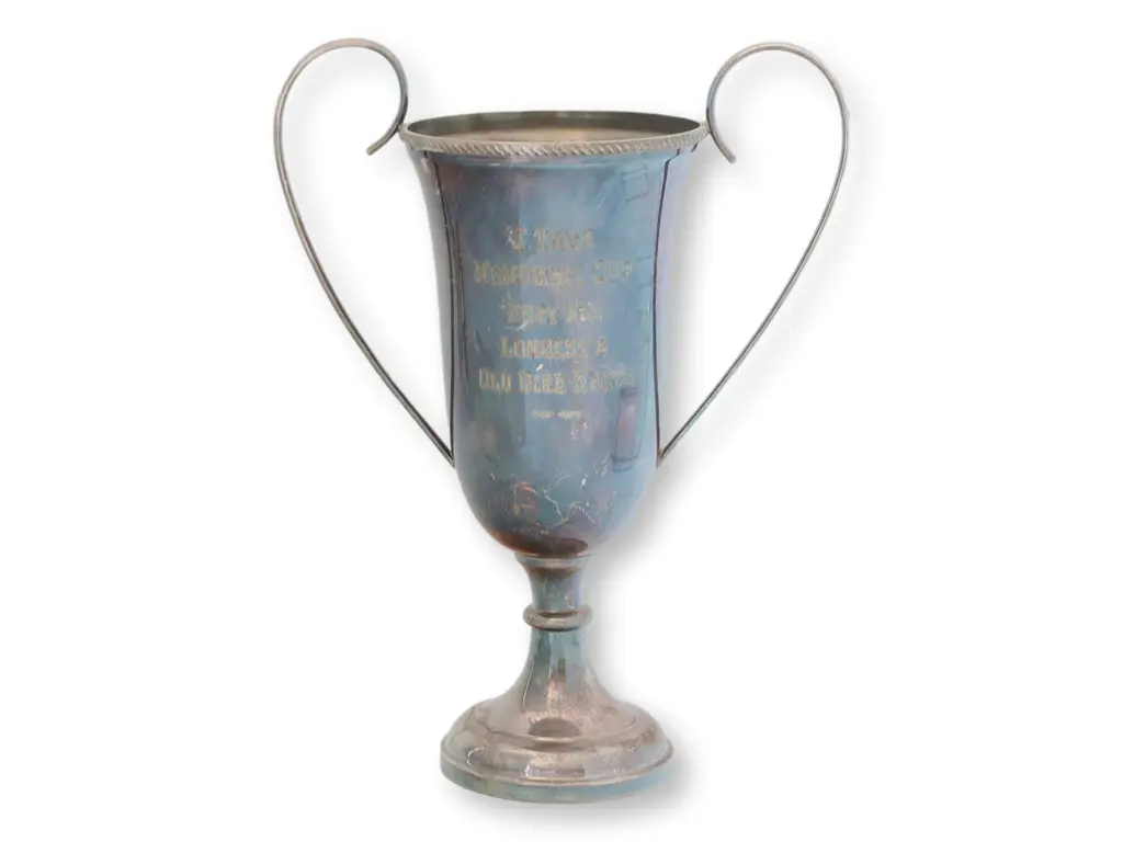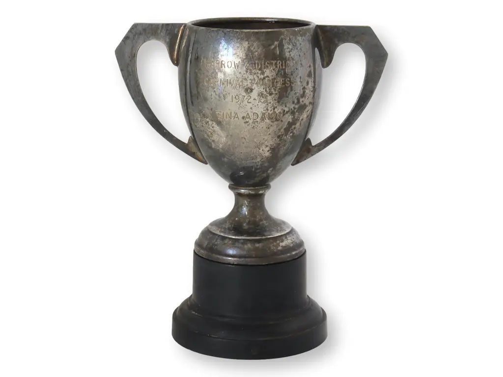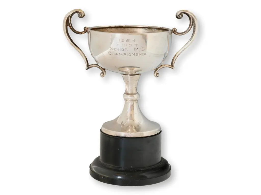 English cycling trophy, engraved "1954 First Senior M/S Championship" and bearing the badge of the Midland Counties Cycling Association. A handsome piece of athletic history, this silver-plated two-handled cup stands on a black base and features graceful scroll handles. A perfect shelf-top accent for the sports enthusiast, cycling historian, or anyone who appreciates the character of vintage awards.