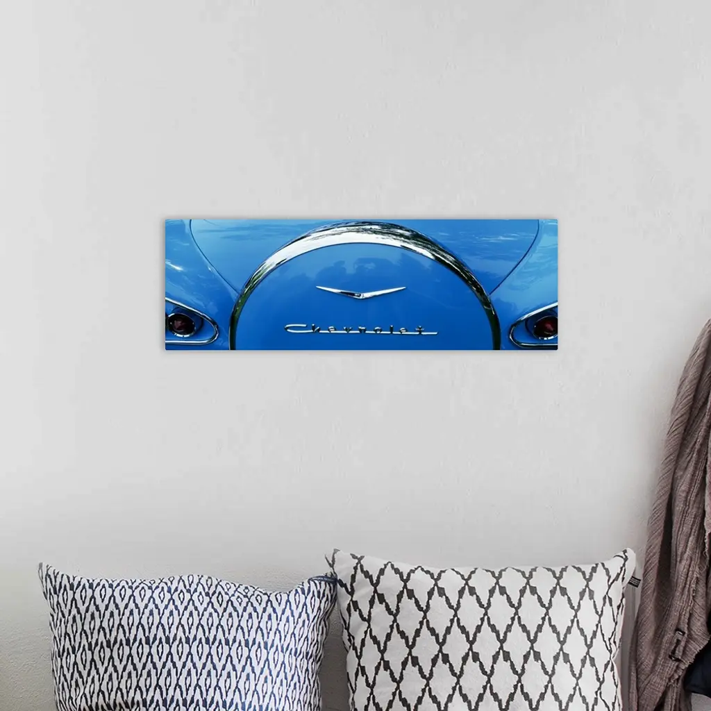 Oversized, landscape photograph of the back end of a shiny blue 1958 Chevrolet Bel-Air, including part of the trunk and taillights with chrome detailing.