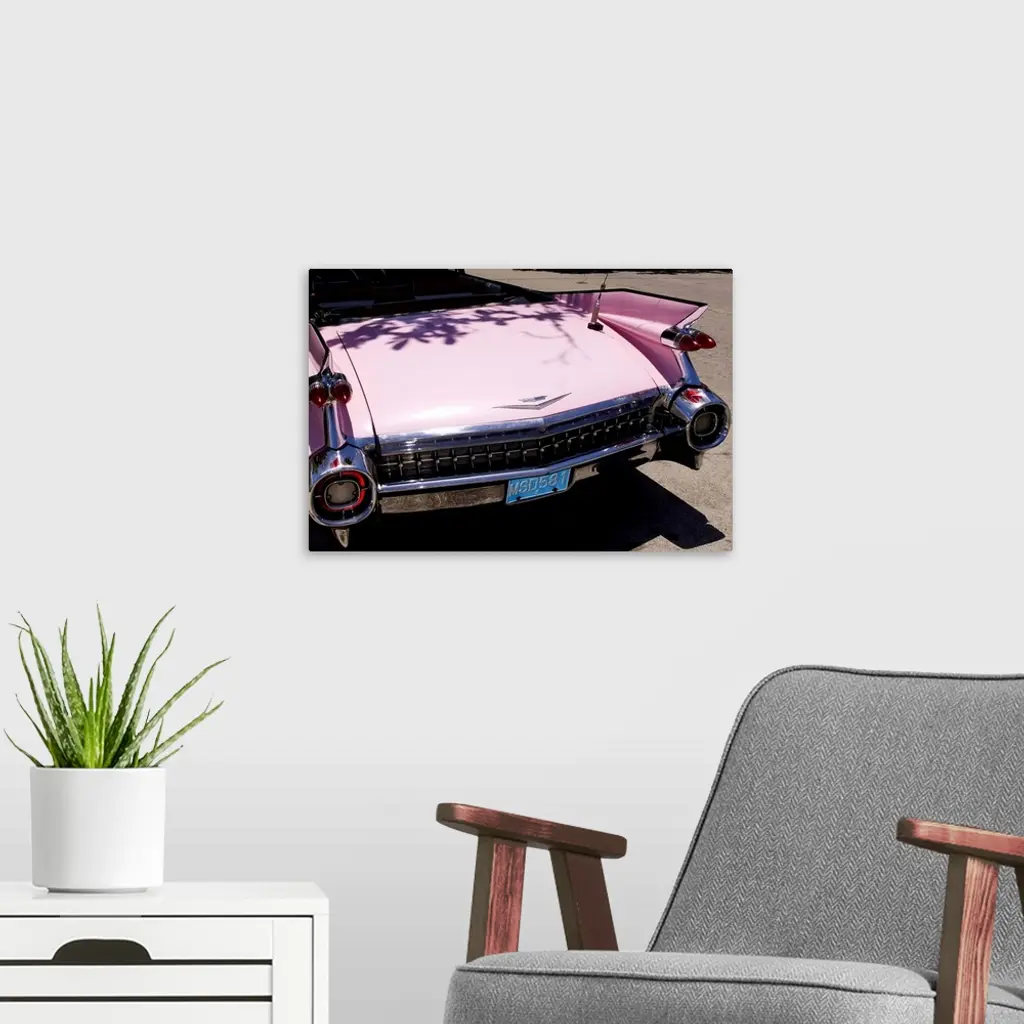 Classic 1959 pink Cadillac convertible on road in beautiful Varadero Beach in Valadero Cuba