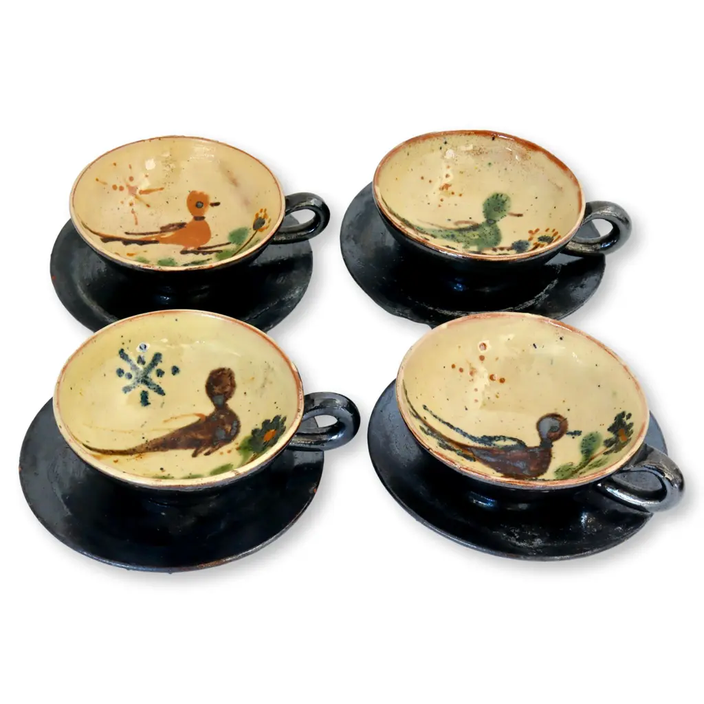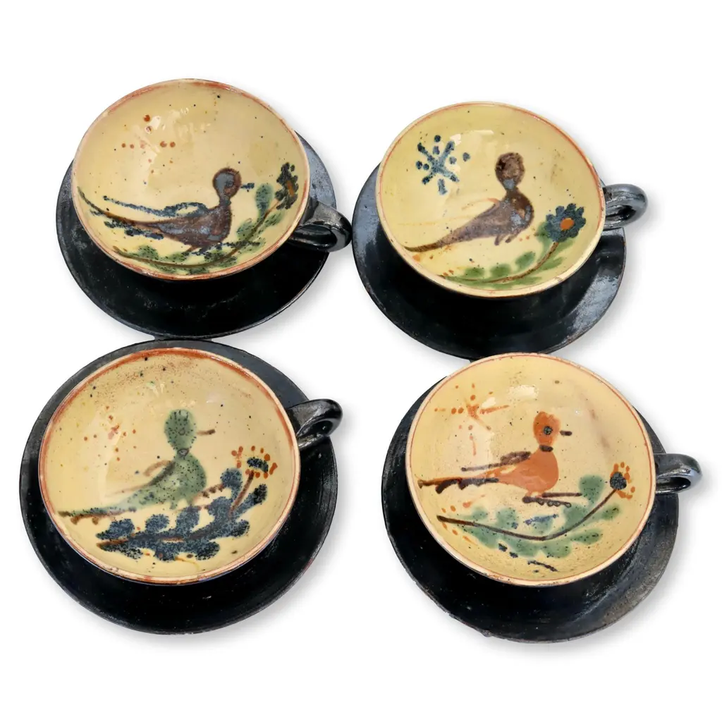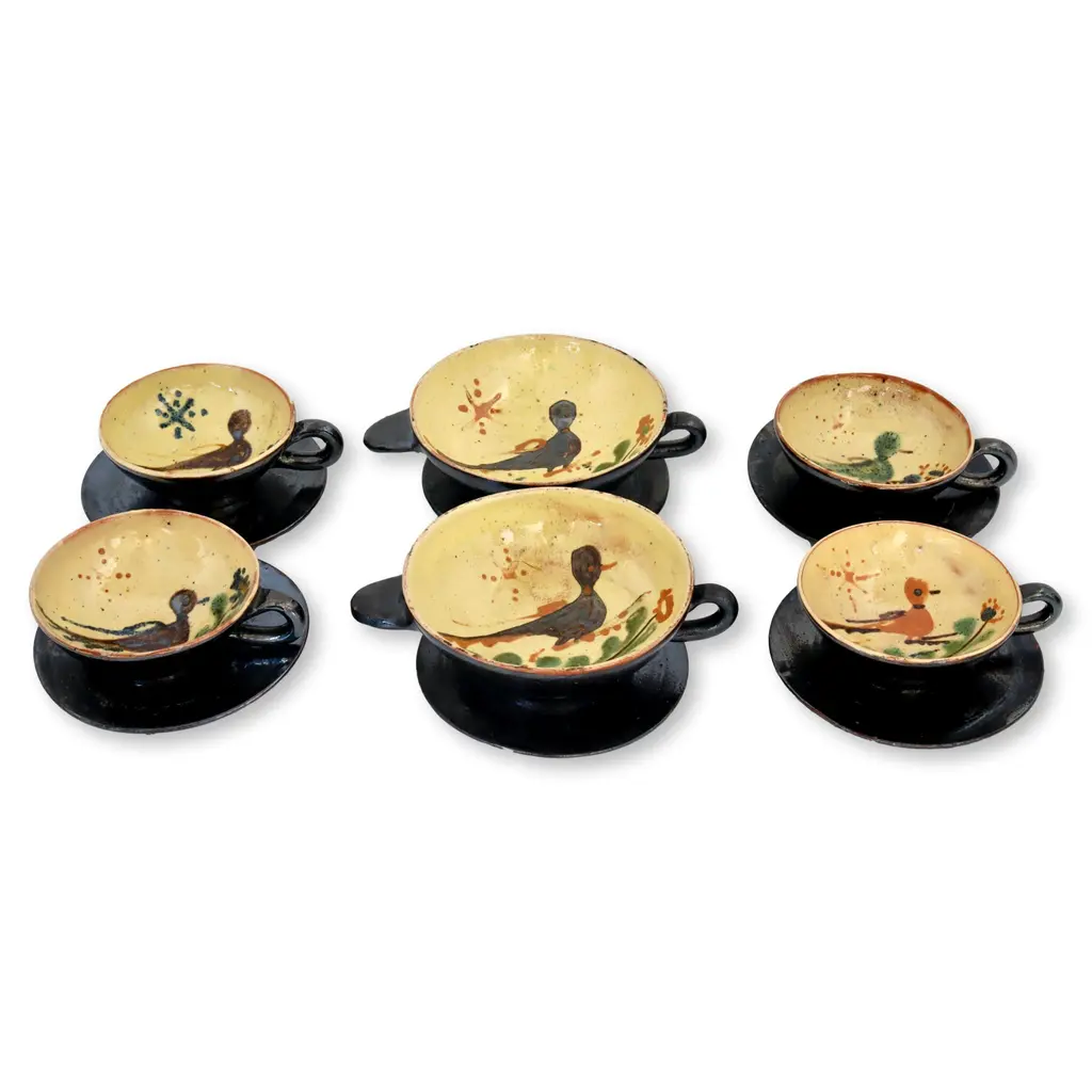French glazed stoneware serving set with birds.Luster over brown glaze, pattern is hand done. Four coffee cups and saucers, cream, sugar and two small serving bowls with saucers. Dimensions: 4 cups, 5.25"L x 4.5"W x 1.5"H; 2 larger bowls, 7.25"L x 5.5"W x 2"H; 6 saucers, 5.5"Dia x .5"H; creamer, 4"L x 3"W x 3.75"H; lidded sugar bowl, 3.5"Dia x 5.5"H. Maker's mark on the underside of 2 larger bowls.