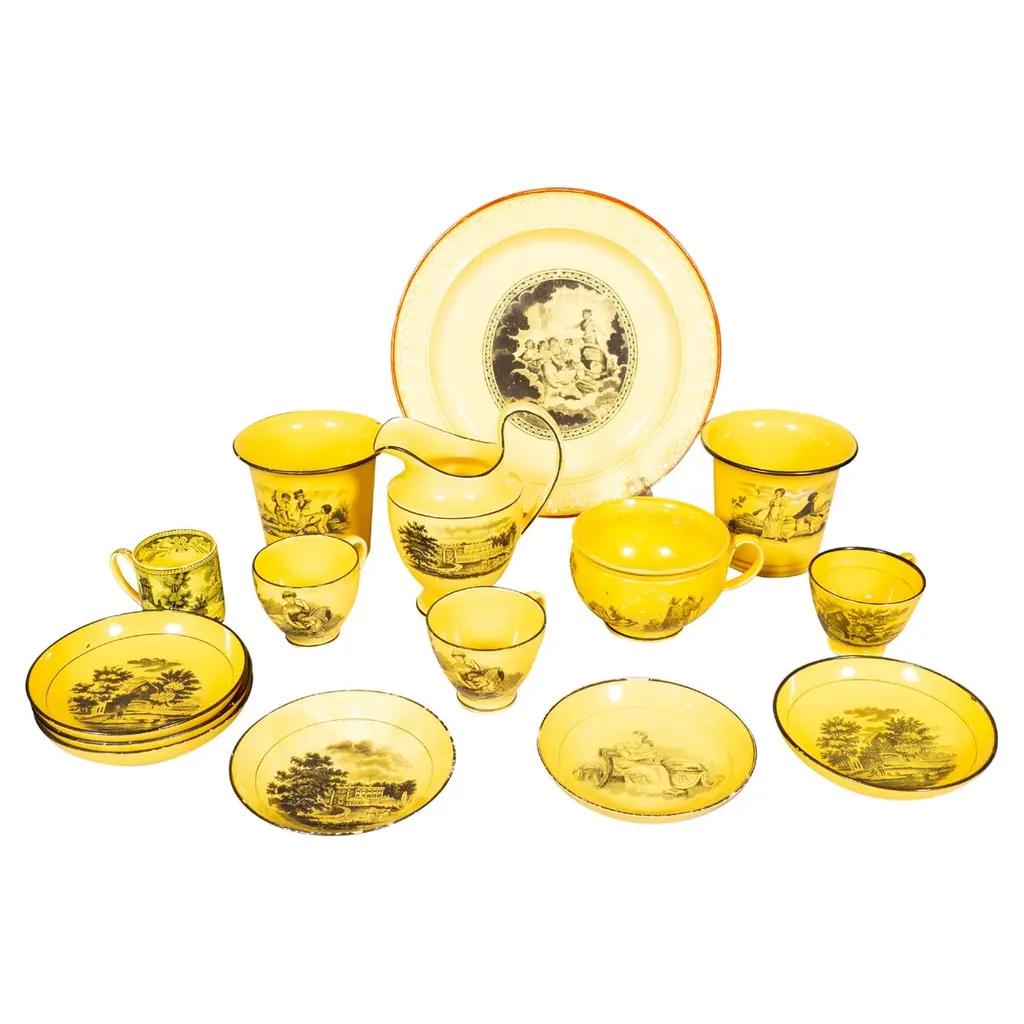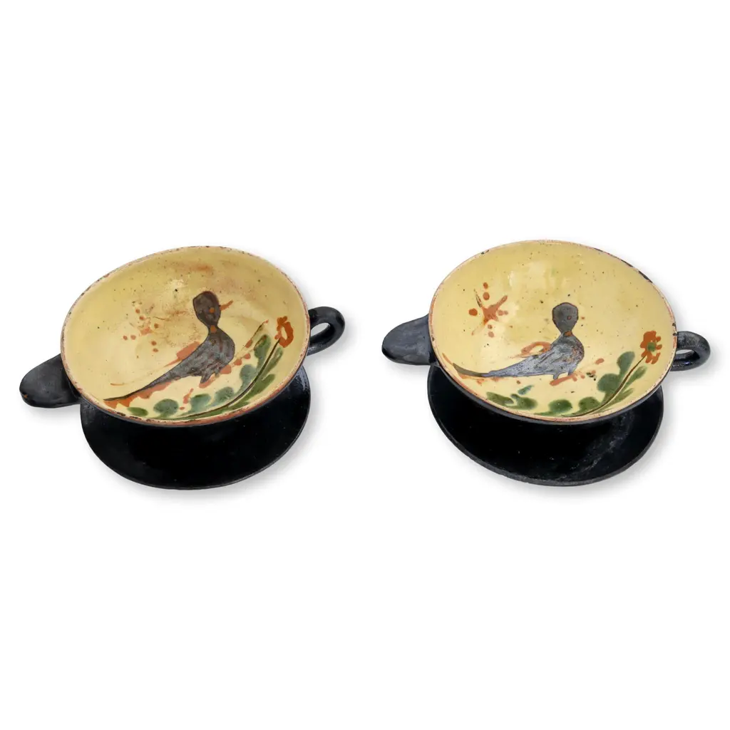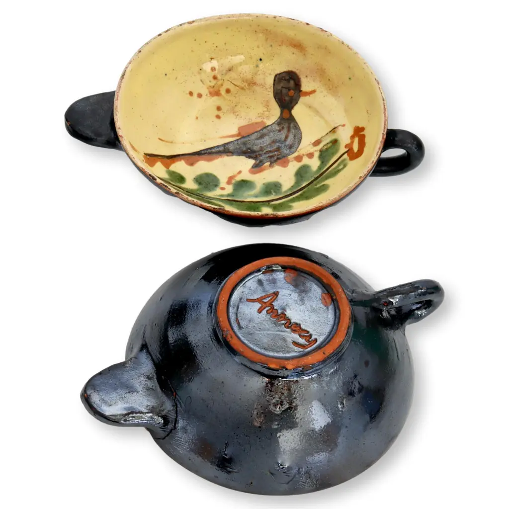 French glazed stoneware serving set with birds.Luster over brown glaze, pattern is hand done. Four coffee cups and saucers, cream, sugar and two small serving bowls with saucers. Dimensions: 4 cups, 5.25"L x 4.5"W x 1.5"H; 2 larger bowls, 7.25"L x 5.5"W x 2"H; 6 saucers, 5.5"Dia x .5"H; creamer, 4"L x 3"W x 3.75"H; lidded sugar bowl, 3.5"Dia x 5.5"H. Maker's mark on the underside of 2 larger bowls.