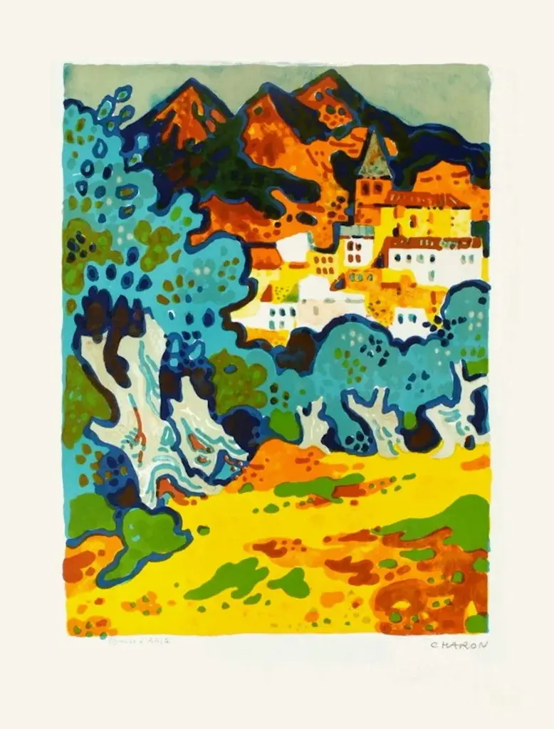 Guy CHARON OLIVE TREE VILLAGE 1967 lithograph on BFK Rives paper signed and numbered in pencil 25.6 x 19.7 in illustration : 20.1 x 15.0 in published by : Guilde de la Gravure edition : 275 copies in mint condition