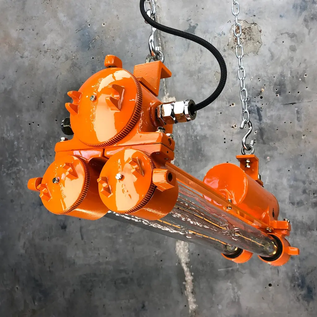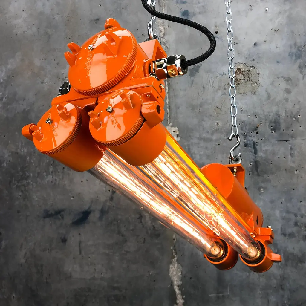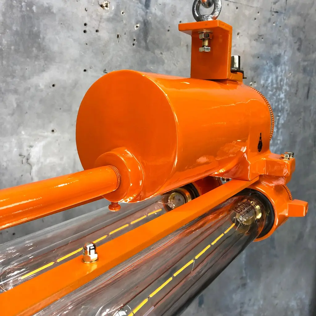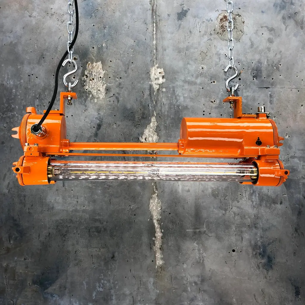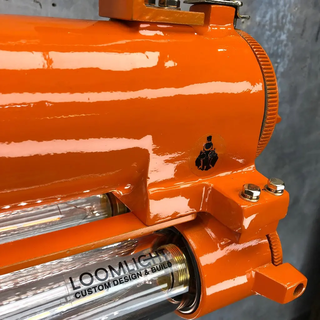 Korean flame proof Edison LED twin strip light made by Daeyang in the 1970s with bespoke signal orange finish.Original item salvaged from supertankers and military vessels then professionally restored.A real example of vintage industrial lighting that you just don't see these days, in fact it would have been impossible to buy these back when they where manufactured as they are NATO fixtures not available to the public.The main body is cast aluminium and with steel and brass fittings, the tubes are formed from glass and are also flame proof. It has some details on the manufacturers plate, which confirm its authenticity.This light has been re-finished in signal orange 2K hardened paint, and all nuts and bolts have been replaced for polished brass equivalents. Specifications.Height 30cmWidth 30cm Length 70cm Weight: 10kg Bulb: 4x Edison 300mm LED E26 Dimmable LED filament. Compatible with 110v USA voltage.All lights are professionally re-wired by our in-house team to exceed British Standards using CE approved components. Dimensions and weights are approximate. For all orders to USA, UL listed bulb holders, wiring and 100v bulbs will be fitted. All lights are sold ready for use in your home or commercial installation. For any specific requirements please get in touch. We are happy to discuss your individual project.