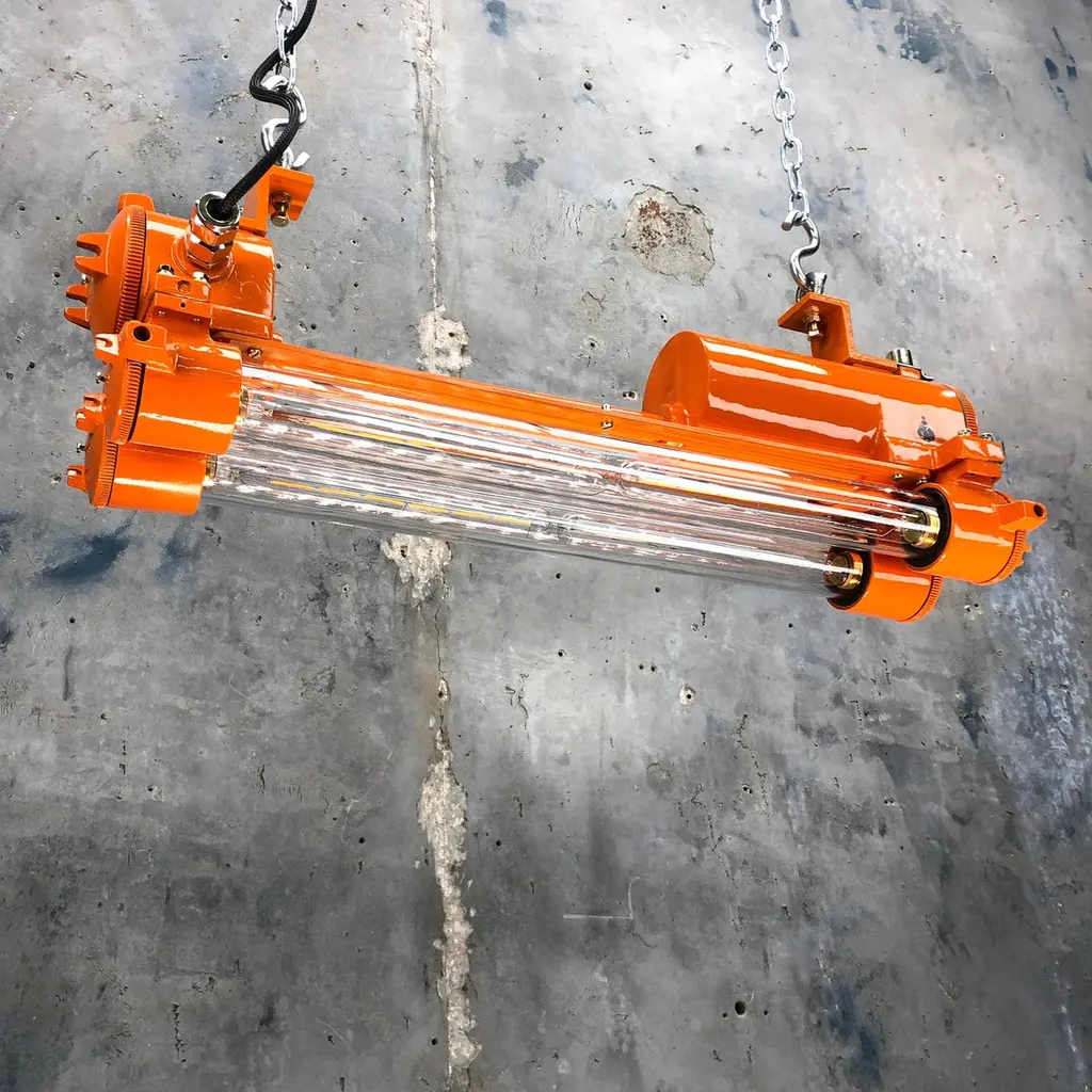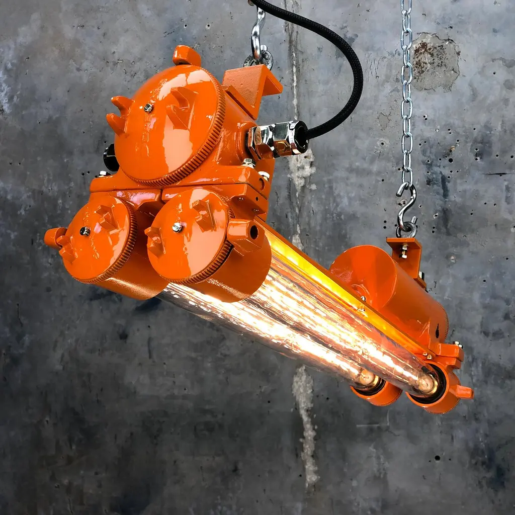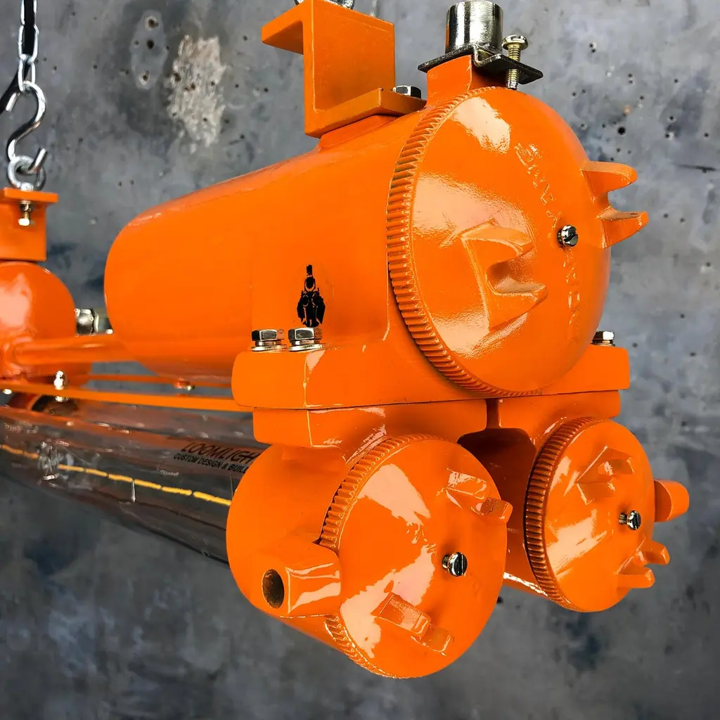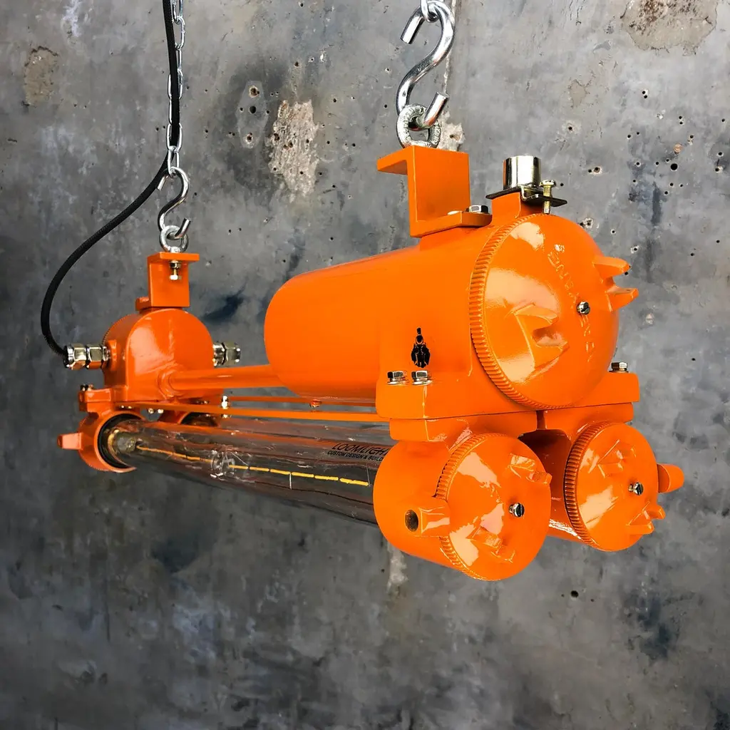 Korean flame proof Edison LED twin strip light made by Daeyang in the 1970s with bespoke signal orange finish.Original item salvaged from supertankers and military vessels then professionally restored.A real example of vintage industrial lighting that you just don't see these days, in fact it would have been impossible to buy these back when they where manufactured as they are NATO fixtures not available to the public.The main body is cast aluminium and with steel and brass fittings, the tubes are formed from glass and are also flame proof. It has some details on the manufacturers plate, which confirm its authenticity.This light has been re-finished in signal orange 2K hardened paint, and all nuts and bolts have been replaced for polished brass equivalents. Specifications.Height 30cmWidth 30cm Length 70cm Weight: 10kg Bulb: 4x Edison 300mm LED E26 Dimmable LED filament. Compatible with 110v USA voltage.All lights are professionally re-wired by our in-house team to exceed British Standards using CE approved components. Dimensions and weights are approximate. For all orders to USA, UL listed bulb holders, wiring and 100v bulbs will be fitted. All lights are sold ready for use in your home or commercial installation. For any specific requirements please get in touch. We are happy to discuss your individual project.