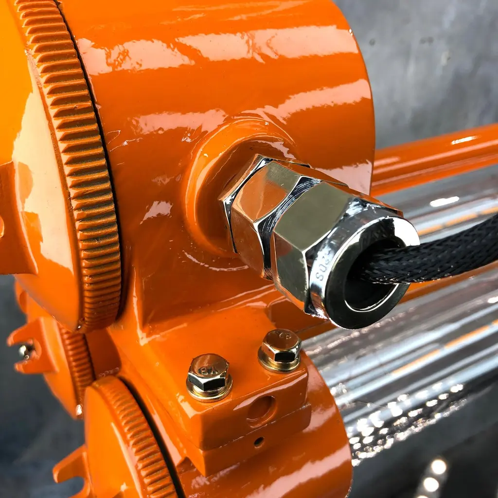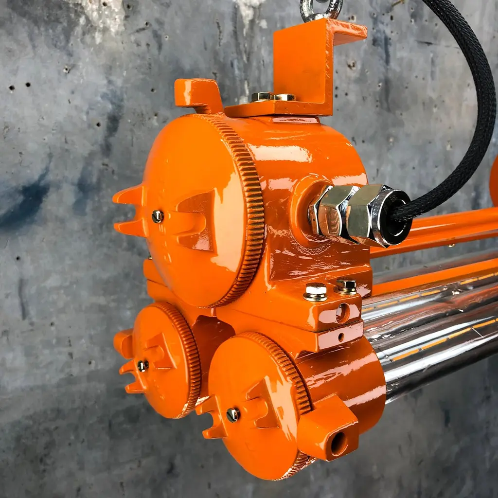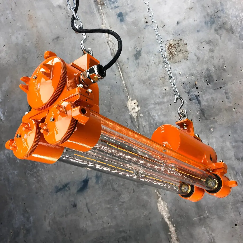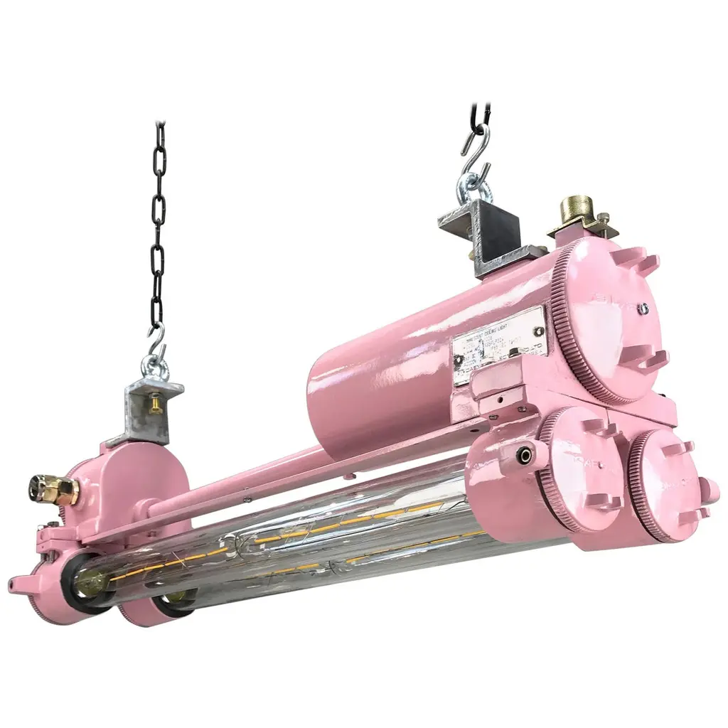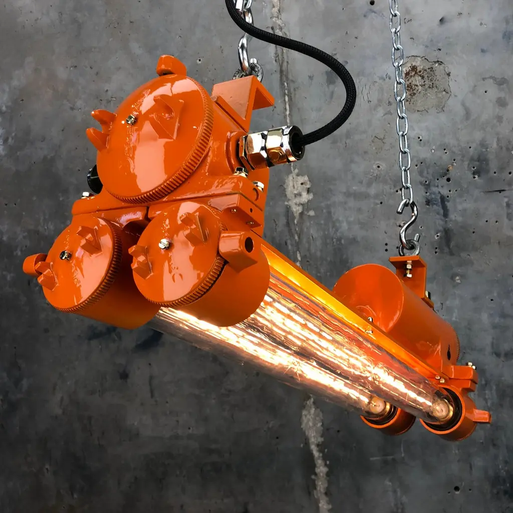 Korean flame proof Edison LED twin strip light made by Daeyang in the 1970s with bespoke signal orange finish.Original item salvaged from supertankers and military vessels then professionally restored.A real example of vintage industrial lighting that you just don't see these days, in fact it would have been impossible to buy these back when they where manufactured as they are NATO fixtures not available to the public.The main body is cast aluminium and with steel and brass fittings, the tubes are formed from glass and are also flame proof. It has some details on the manufacturers plate, which confirm its authenticity.This light has been re-finished in signal orange 2K hardened paint, and all nuts and bolts have been replaced for polished brass equivalents. Specifications.Height 30cmWidth 30cm Length 70cm Weight: 10kg Bulb: 4x Edison 300mm LED E26 Dimmable LED filament. Compatible with 110v USA voltage.All lights are professionally re-wired by our in-house team to exceed British Standards using CE approved components. Dimensions and weights are approximate. For all orders to USA, UL listed bulb holders, wiring and 100v bulbs will be fitted. All lights are sold ready for use in your home or commercial installation. For any specific requirements please get in touch. We are happy to discuss your individual project.
