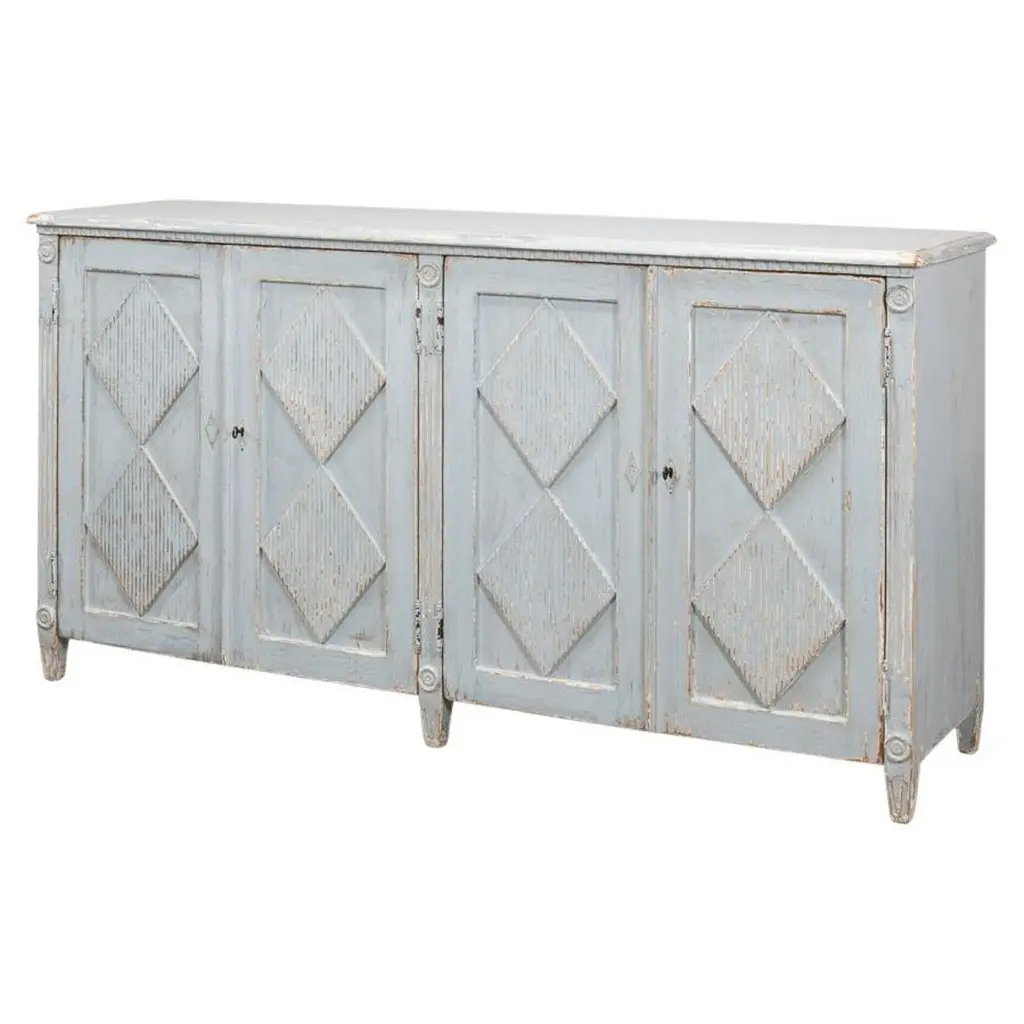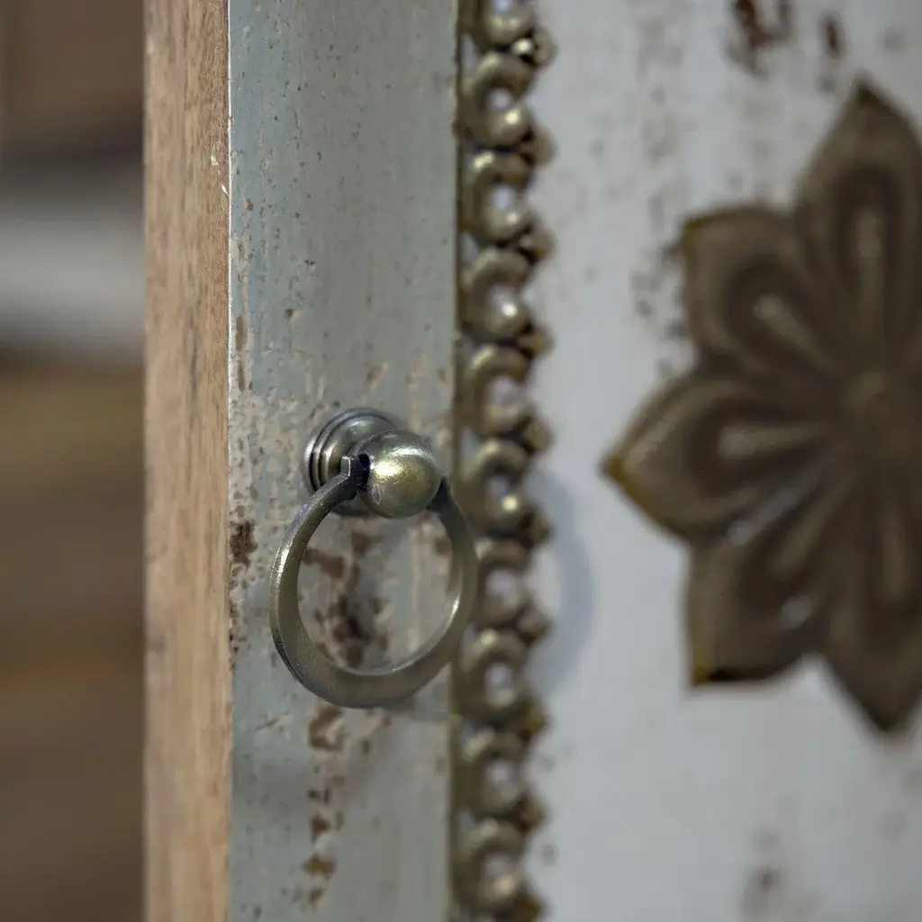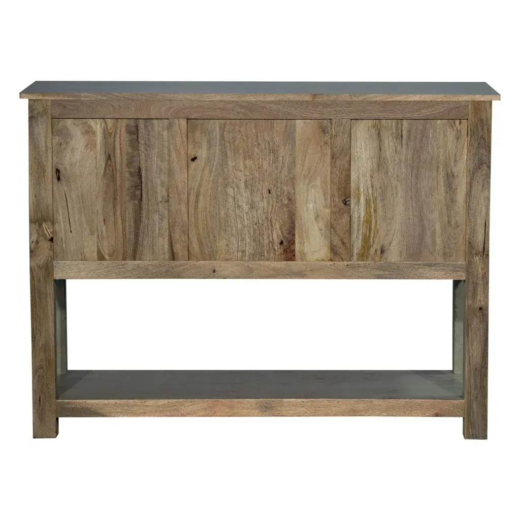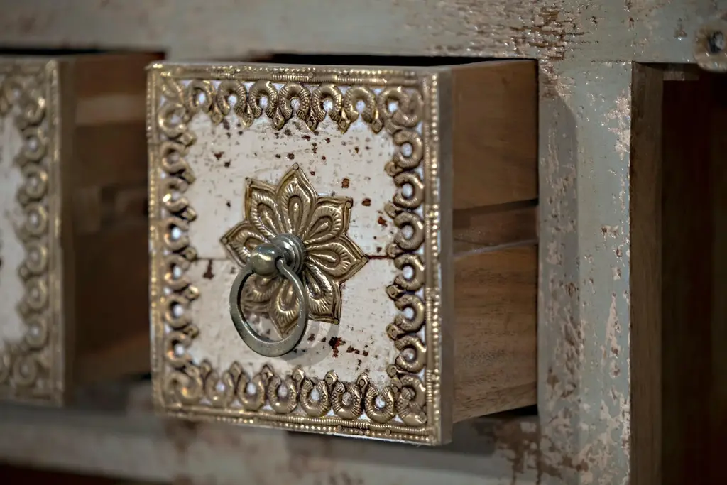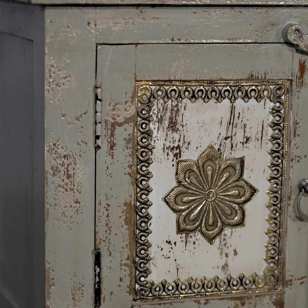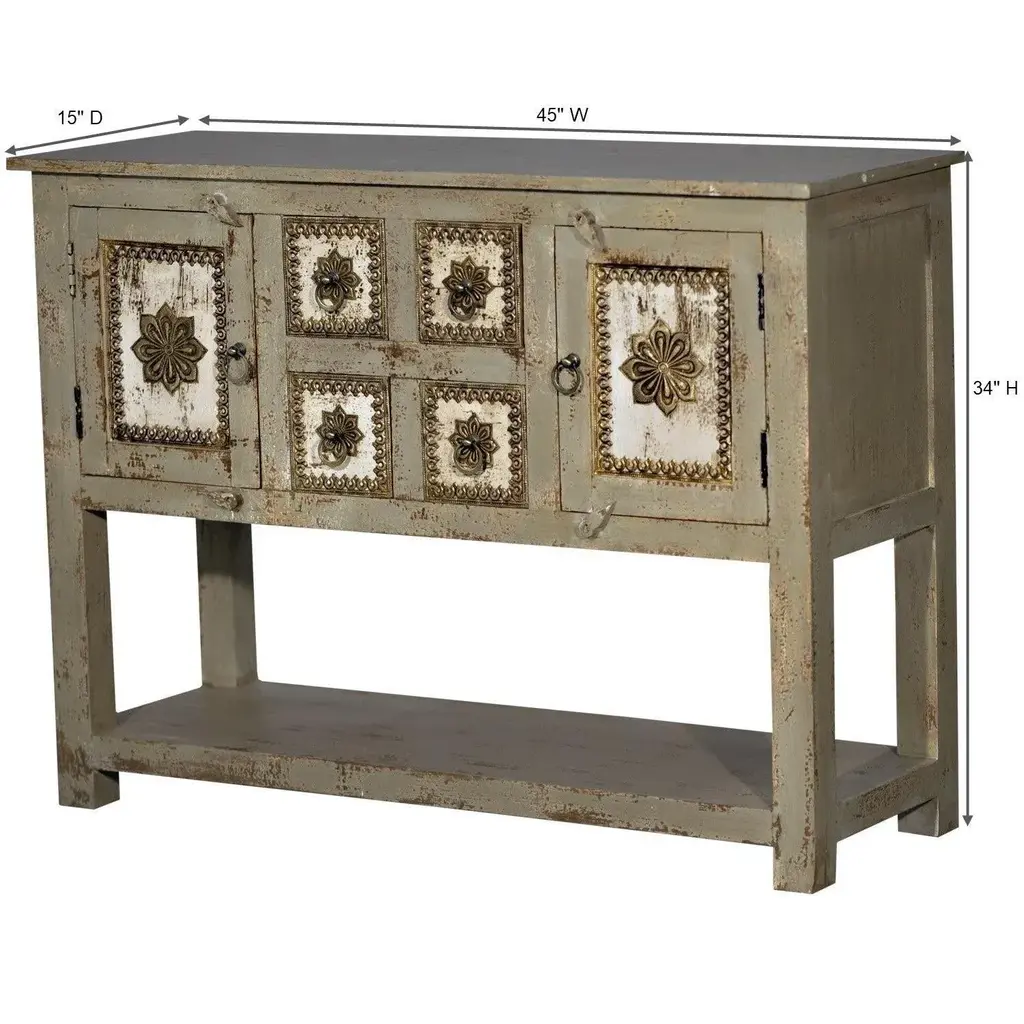 Dimensions: 45”wide X 15”deep X 34”high Features: • 100% solid wood construction with brass accents • Handmade by skilled artisans • Gray green distressed finish • 2 doors and 4 drawers • Eclectic transitional style • Environmentally friendly and sustainable This piece is handcrafted by artisans using basic hand tools. Due to the nature of this creative process, you can expect to find variations in their finish and color. Imperfections like uneven planks, knots, warping, cracks, splits, holes, discoloration, dents, scratches, wood repairs etc. are normal and considered enhancements to the nature of our collection. The listed dimensions are measured from one extremity to the other, height wise and width wise. Please contact us for specific dimensions. Construction: 100% Solid Wood Please note that color of products shown may vary slightly from their actual color due to monitor display settings or photography studio lighting. Please contact us for additional pictures. Thanks for looking! We enjoy serving you.
