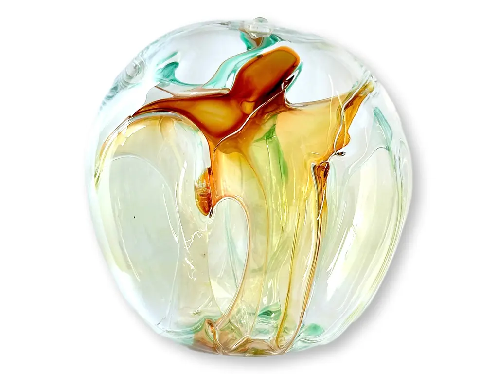 Signed studio glass orb by Vermont-based glass artist Peter Bramhall, dated 22 July 1996. Known for his organic, free-blown forms, Bramhall��who now creates under the name Paedra Bramhall—has long been celebrated for his experimental approach to glass. This sculptural piece features flowing hues of amber, green, and celadon suspended in clear glass, capturing light and motion in a striking, one-of-a-kind form. A brilliant work of art that showcases Bramhall���������s mastery of form and fluidity. Signed