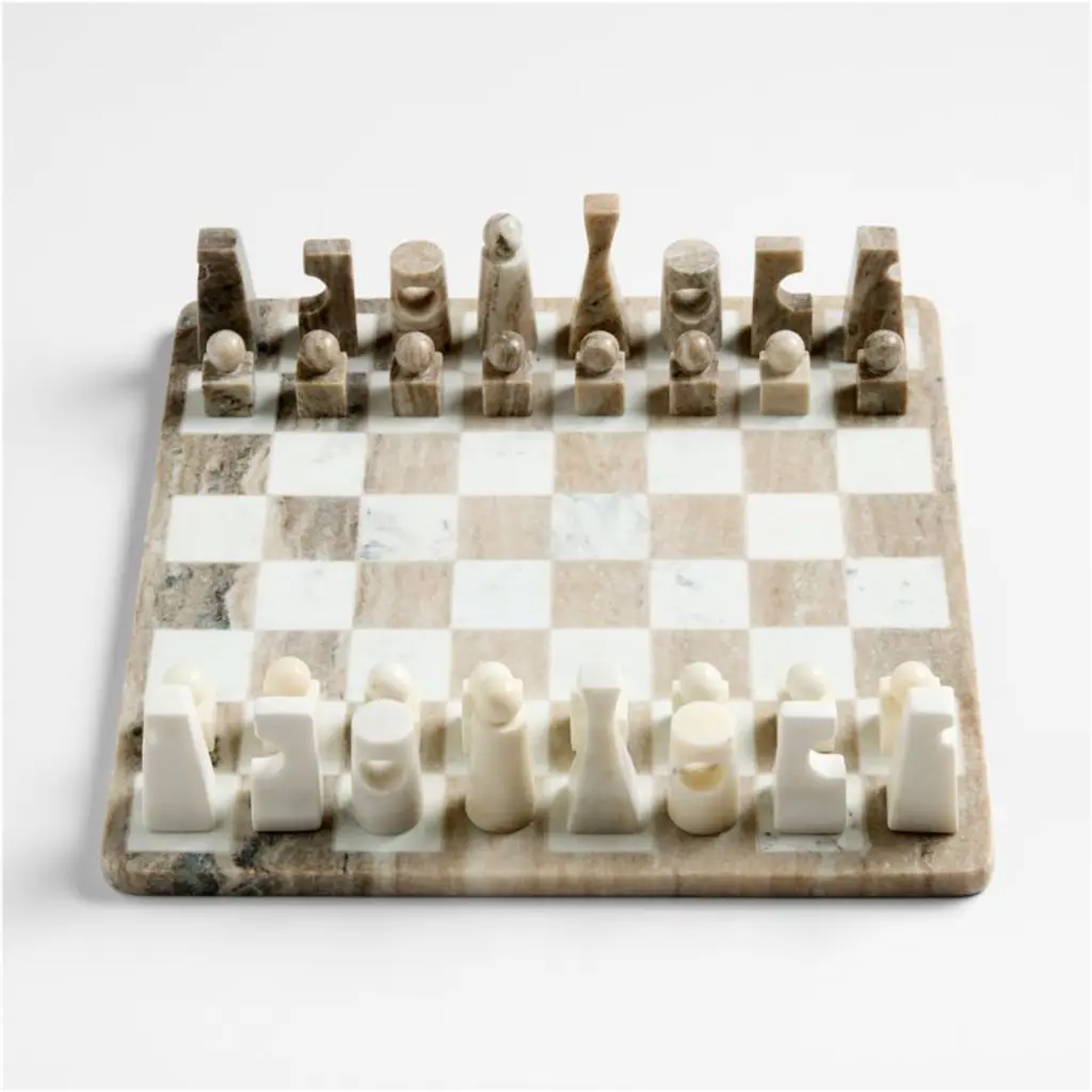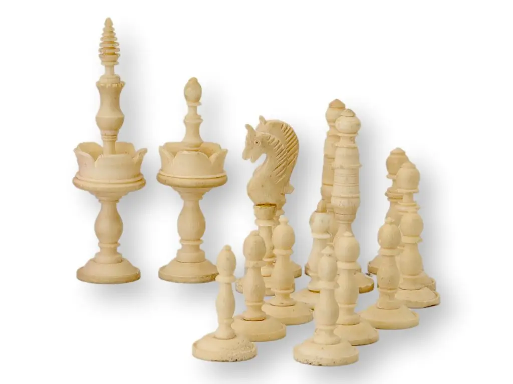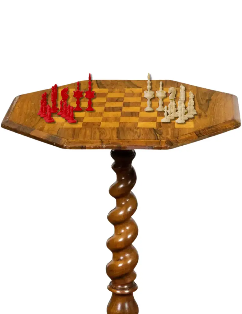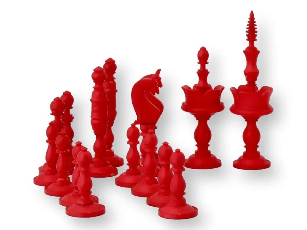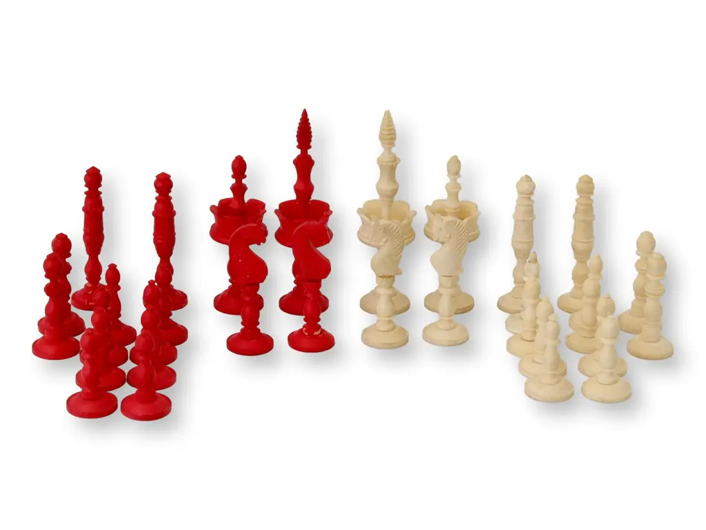 Mid 19th-C English Carved Bone Chess Set from circa 1880. This set boasts hand-carved, red-stained and cream pieces, each bearing meticulous detailing, exemplifying masterful craftsmanship of the era. With its petit size, it's both enchanting and playable on boards of various sizes. Remarkably, the set remains complete with no replacement pieces, preserving its authentic charm. A true collector's gem, merging history and artistry. Size range; smallest 1"Dia x 1.25"H to largest at 1"Dia x 3.25"H.