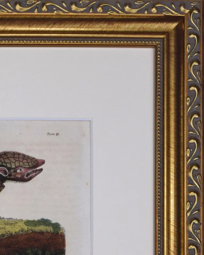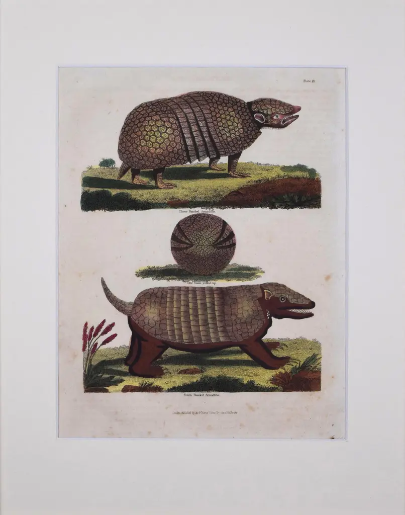 19th Century hand colored armadillo engraving. Antique copper plate published by Thomas Kelly, London for "A Natural History, General and Particular" by The Comte de Buffon and William Smellie. Presented in cream colored matting and a bronze-gold wood frame. C. 1820s