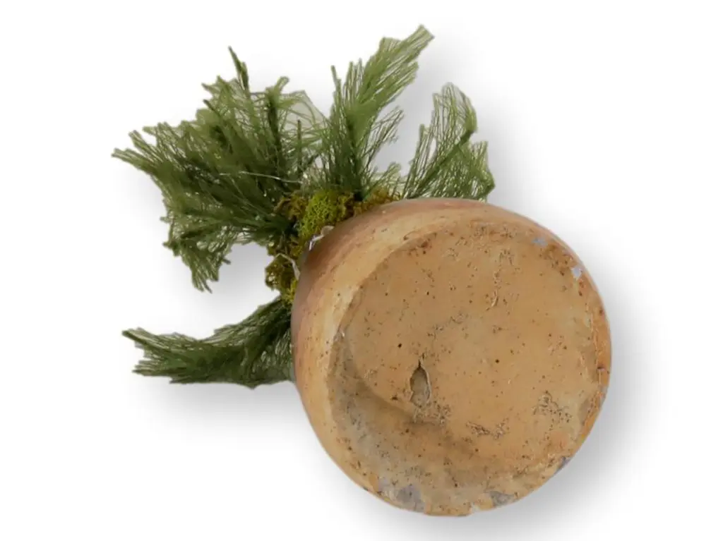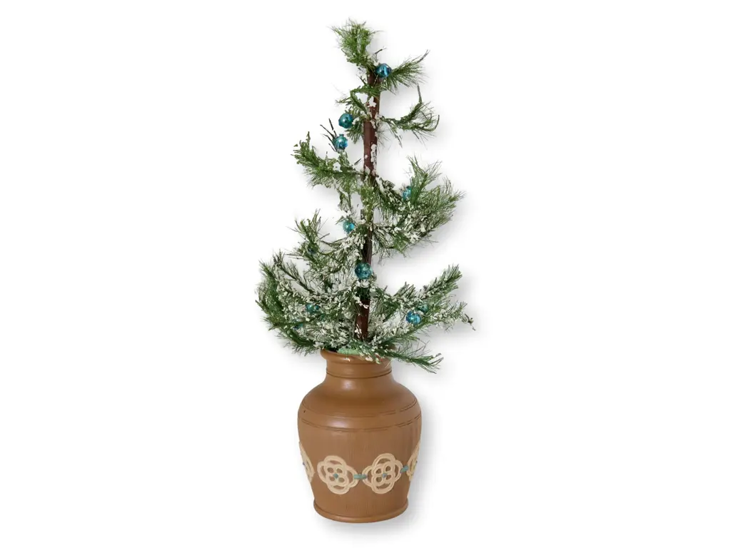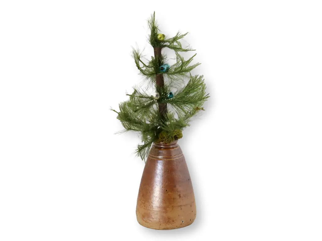 Capture the essence of nostalgia with our miniature vintage feather tree, artfully displayed in an antique stoneware ink pot. This charming piece evokes a bygone era, combining holiday spirit with antique charm, making it a unique addition to your festive decor. This tasteful combination makes a great hostess gift, adding sophistication and a touch of merriment to any celebration.