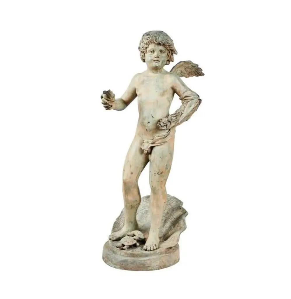 Found in Paris, this 19th C. Chérubin Fountain is made from bronze and has an aged, vert (green based) patina. This fountain is exceptionally cast and the bronze has aged well. You will notice a pair of mating tortoises on the bottom of the fountain symbolising love and togetherness. This fountain is a true French representation of romanticism, and would look spectacular in any garden as a statuary piece or working fountain. The water spurts out of the Chérubins' shell he is holding. The size of this product:Width: 57 cmHeight: 117 cmBase: 43 cm