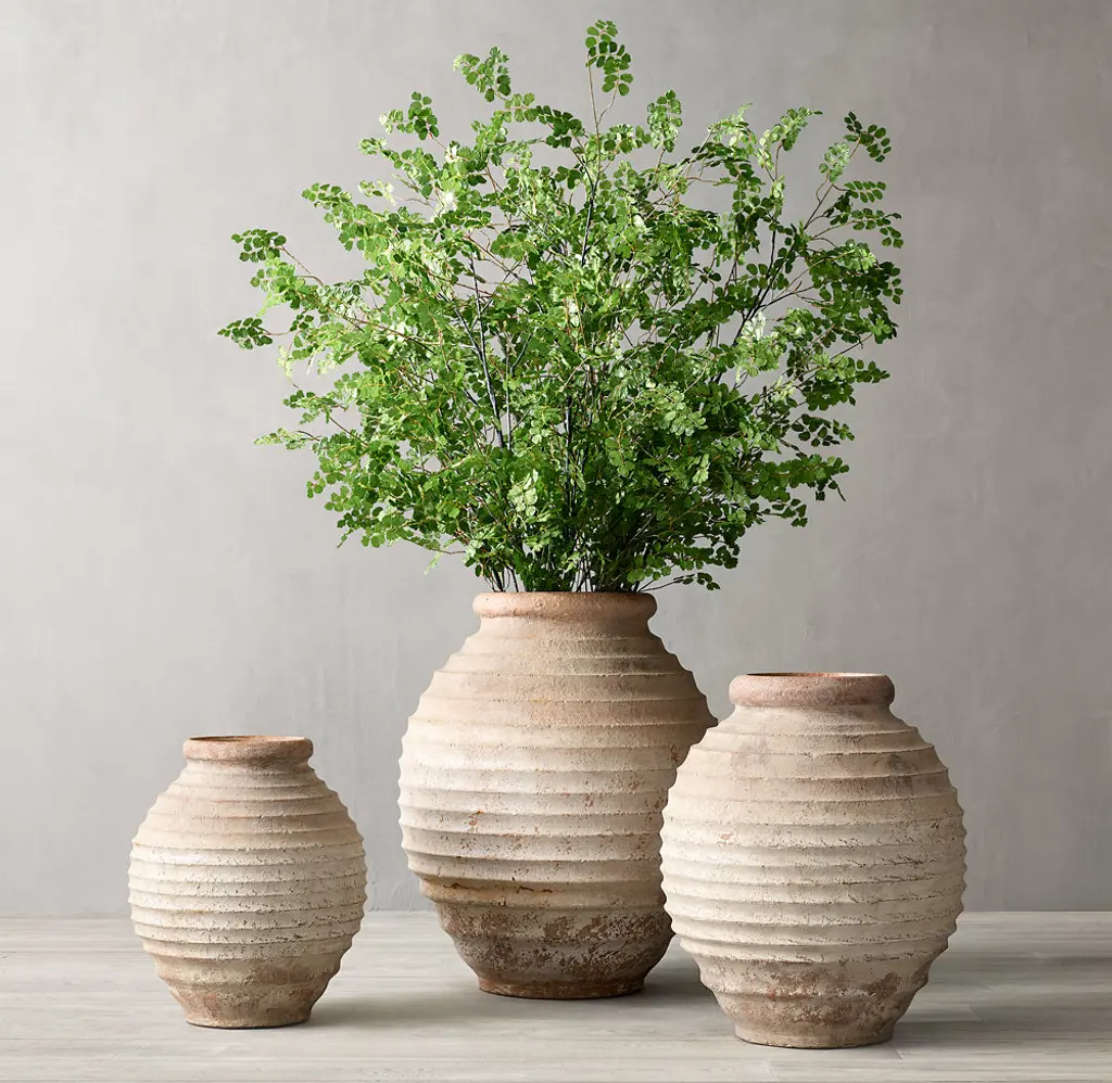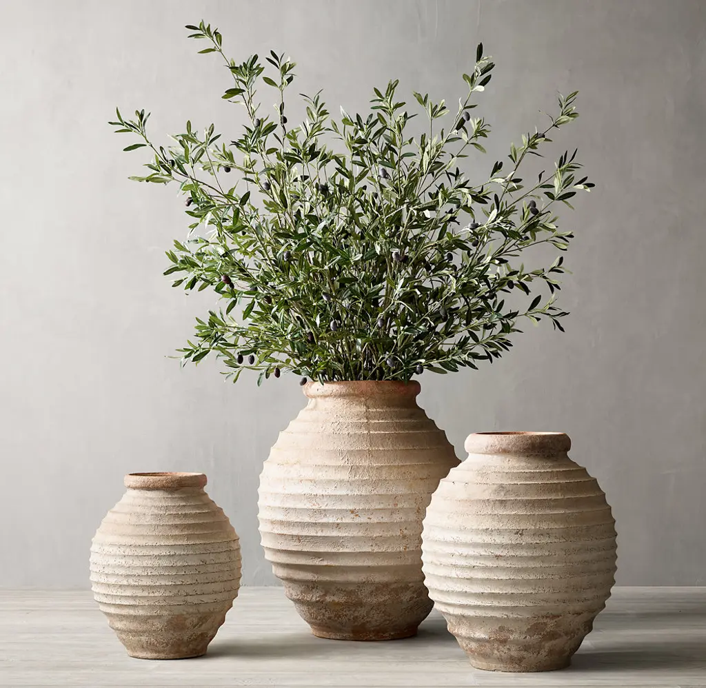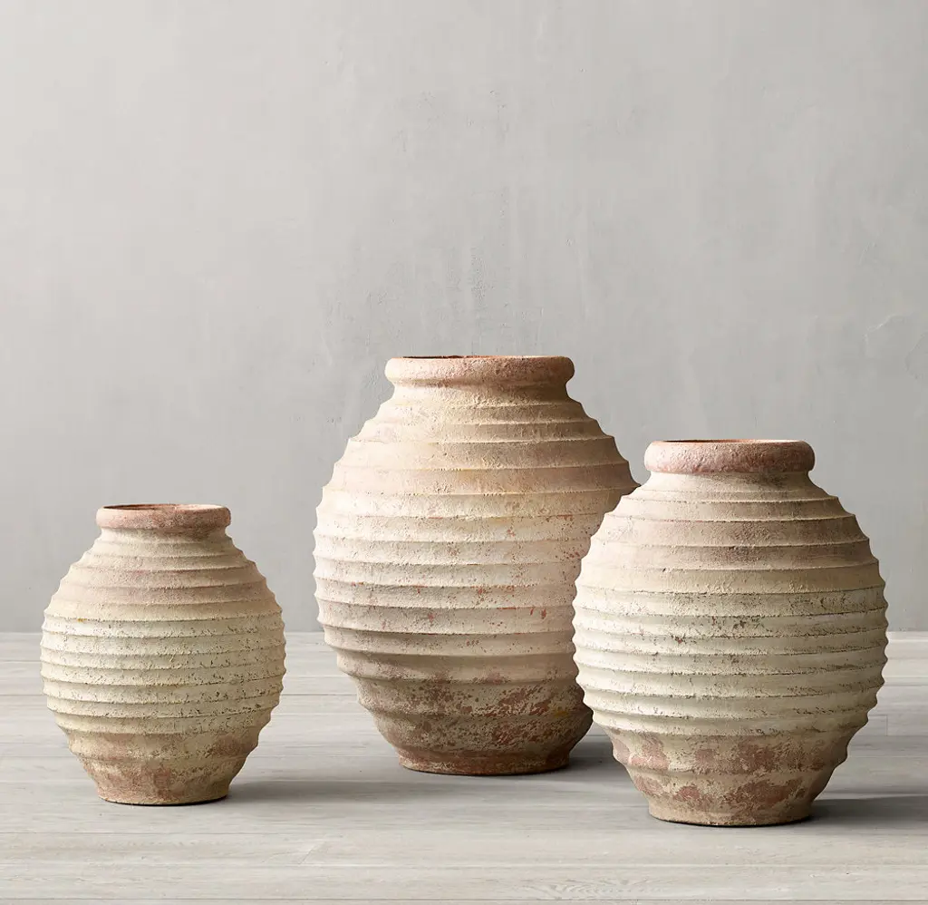 Our primitive vessel was hand cast from an original Turkish terra-cotta jar, traditionally used for transporting olives and other fruit. Meticulously crafted of concrete composite, our version faithfully replicates the sun-baked color, weathered patina and ribbed, rough-hewn texture of the original.