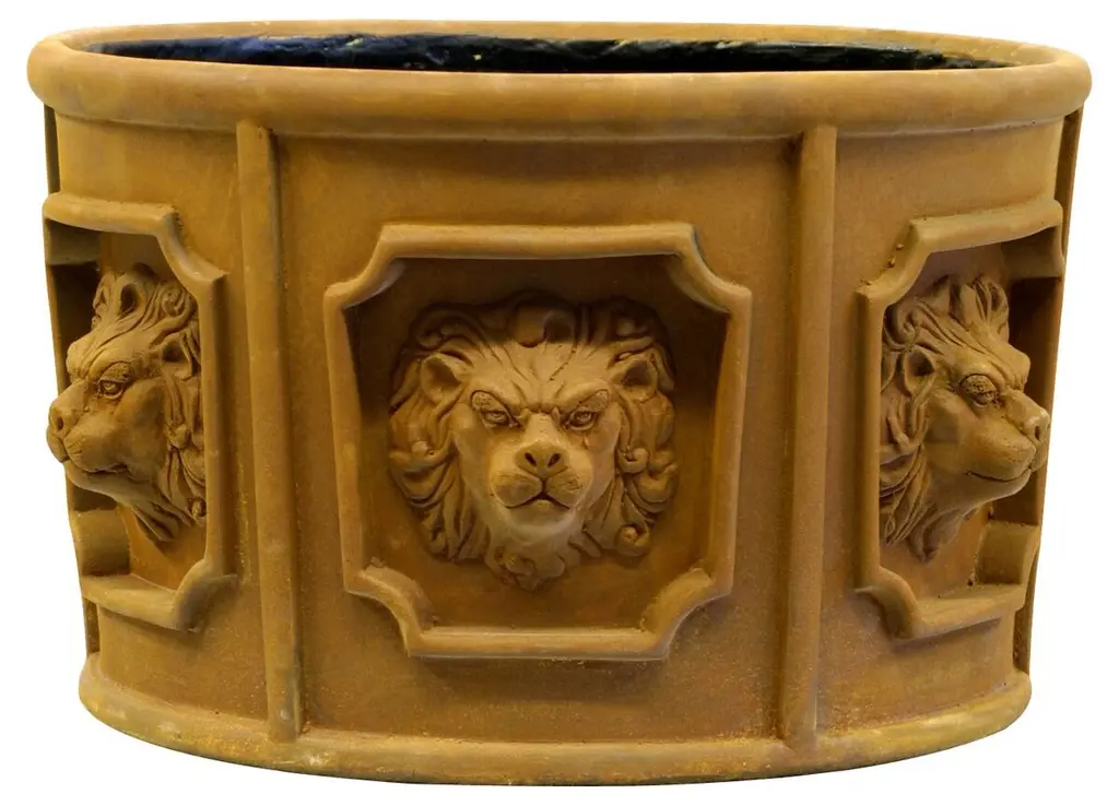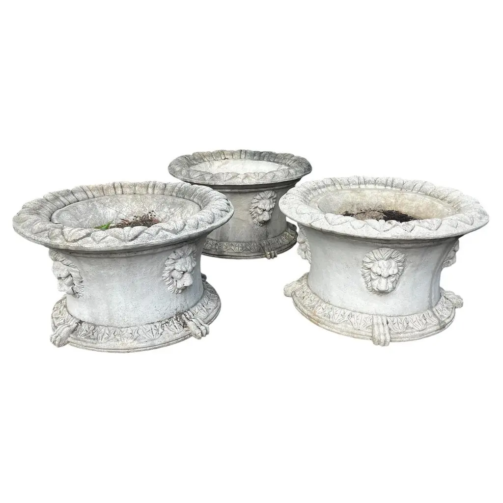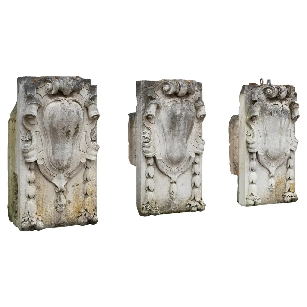 19th C. Terracotta Lion Head Regency Style Building Garden Architectural Elements. Items are decorated with finely cast lion heads, stylized Fleur-de-lis and scroll work, and beautiful and authentic weathered patina. Great for use as decorative indoor or outdoor garden elements. Each element weighs approximate 50 lbs and are approximate 22" - 26" Long. (There are 9 rights and 2 lefts. Price is per item.) Circa Late 19th Century. Measurements: 12" H x 24" W x 11" D.