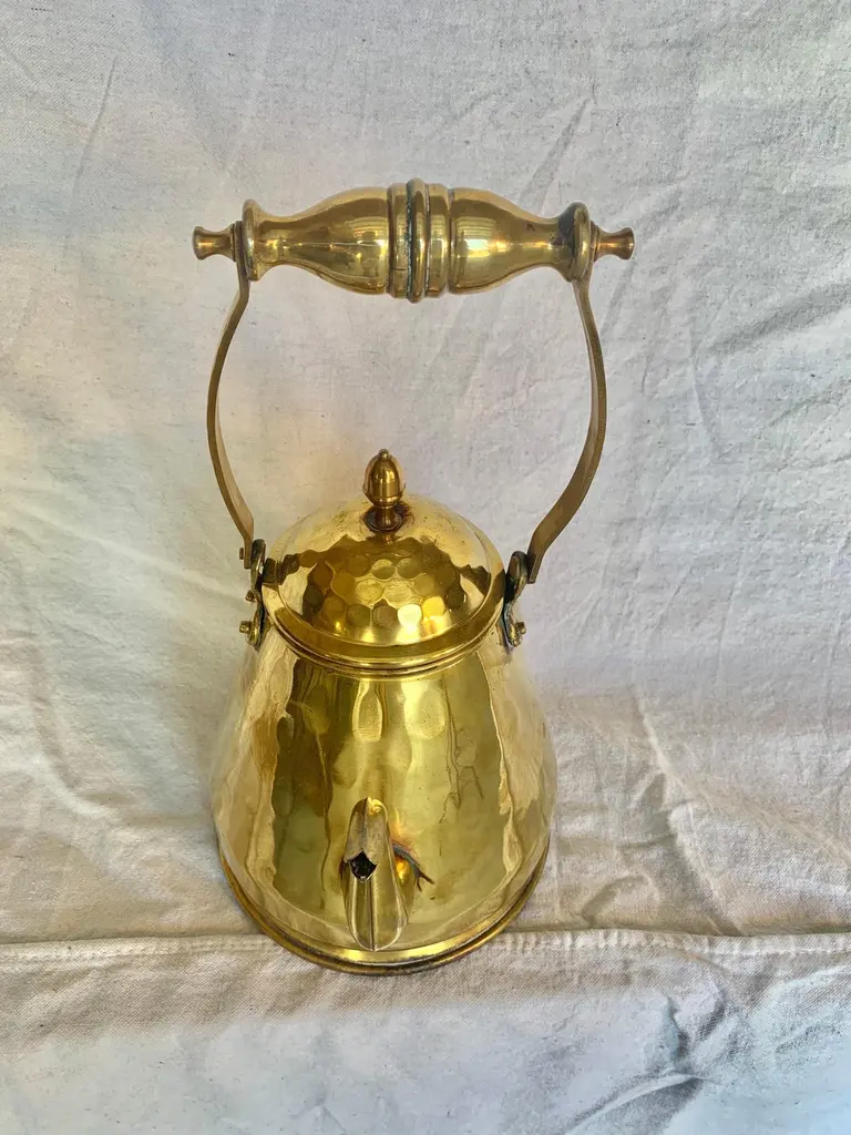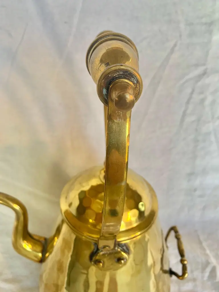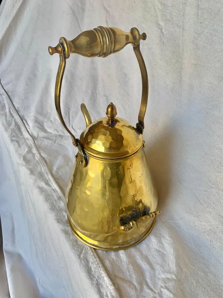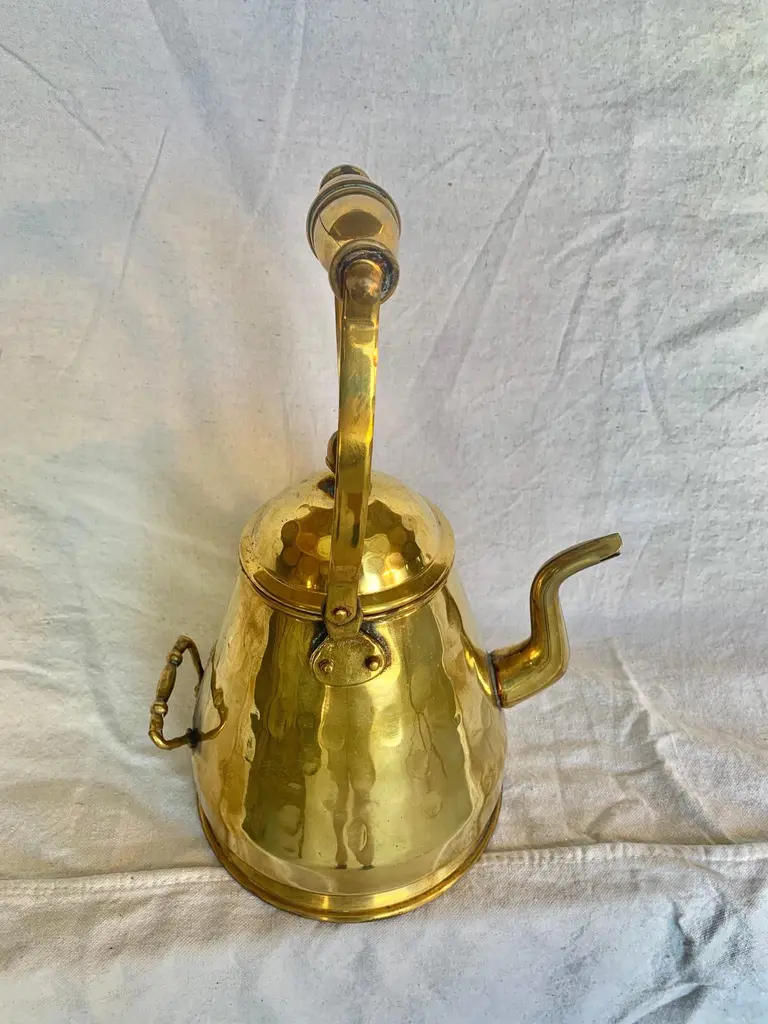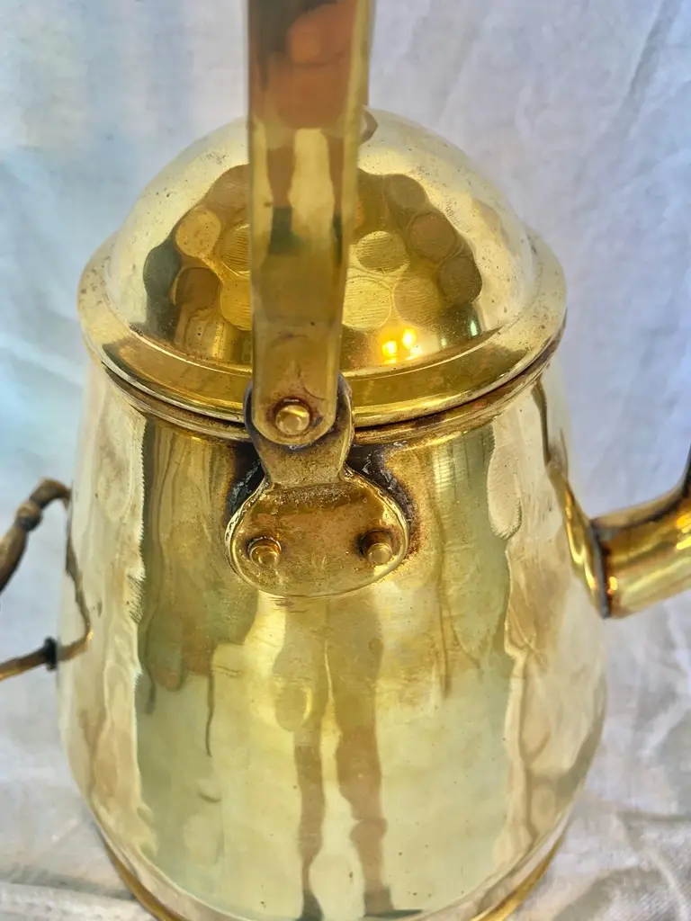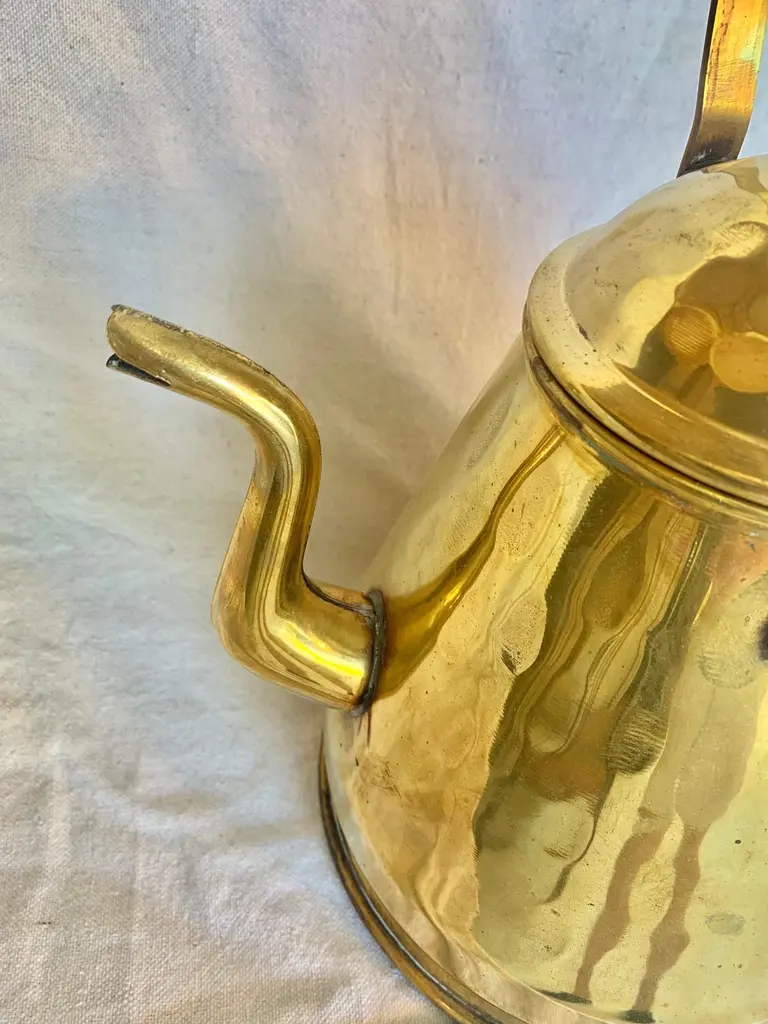 This 19th Century Kettle was crafted from brass by artisans in the late 1800's. The piece features two intricately detailed handles that lead to the kettle. The seams are all hand soldered and careful detail has been put into the design. The spout is a lovely traditional shape and the lid fits snugly to the kettle. This unique 19th Century Brass Kettle with it's aged brass patina will be a design element when added to any kitchen.10"W x 7.25"D x 13"H