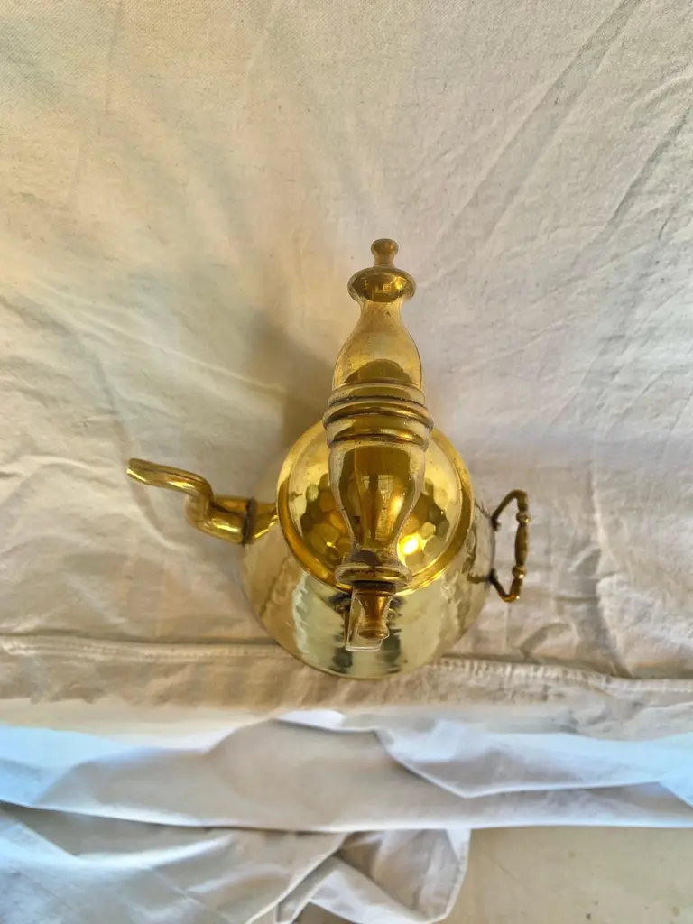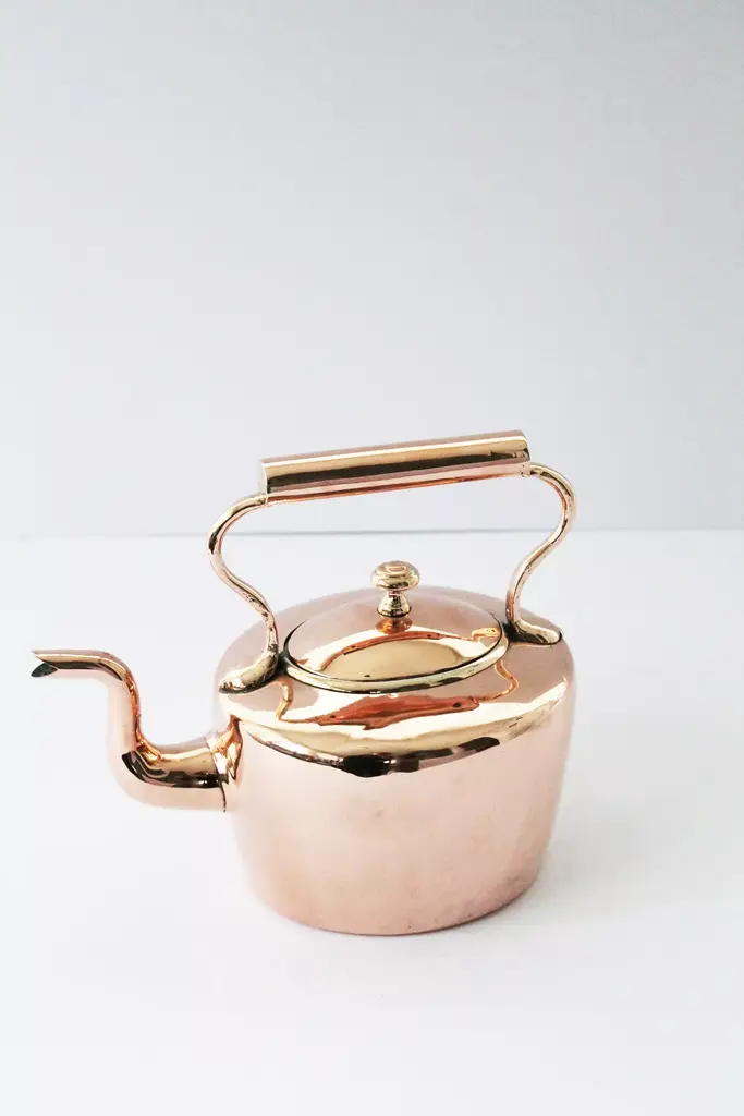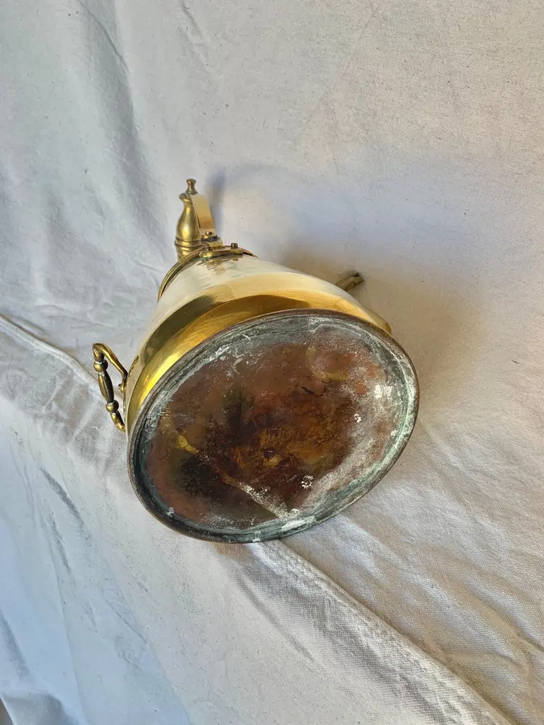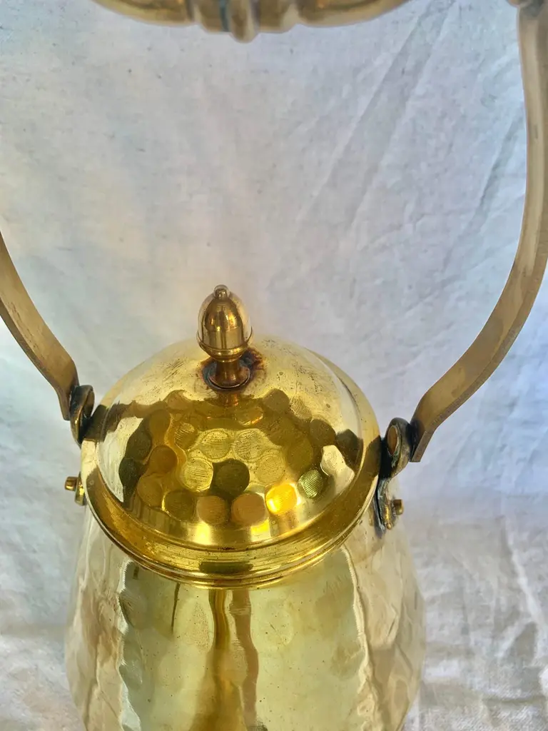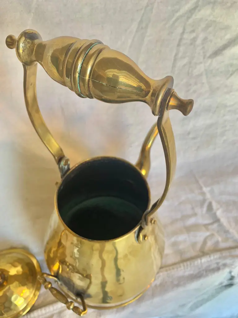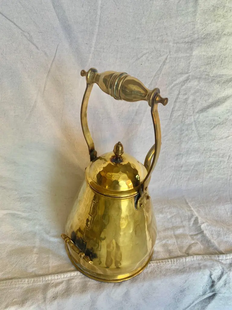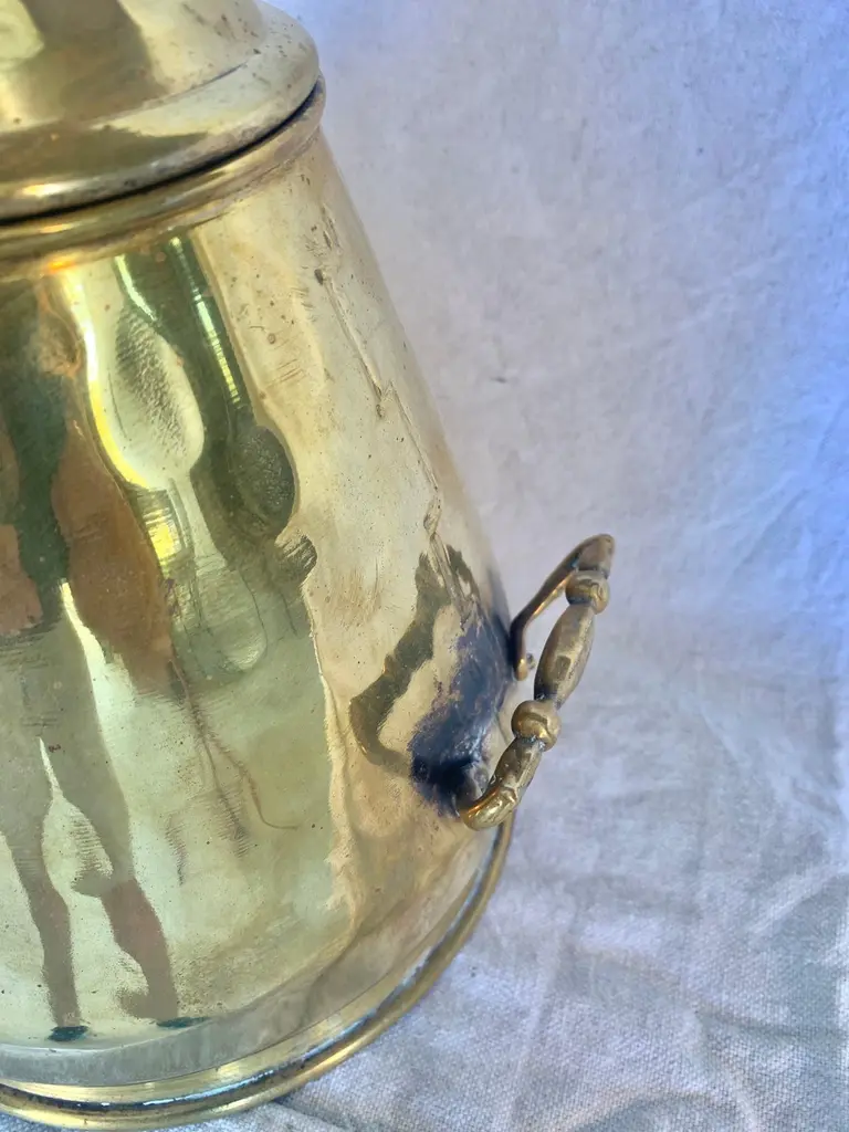This 19th Century Kettle was crafted from brass by artisans in the late 1800's. The piece features two intricately detailed handles that lead to the kettle. The seams are all hand soldered and careful detail has been put into the design. The spout is a lovely traditional shape and the lid fits snugly to the kettle. This unique 19th Century Brass Kettle with it's aged brass patina will be a design element when added to any kitchen.10"W x 7.25"D x 13"H